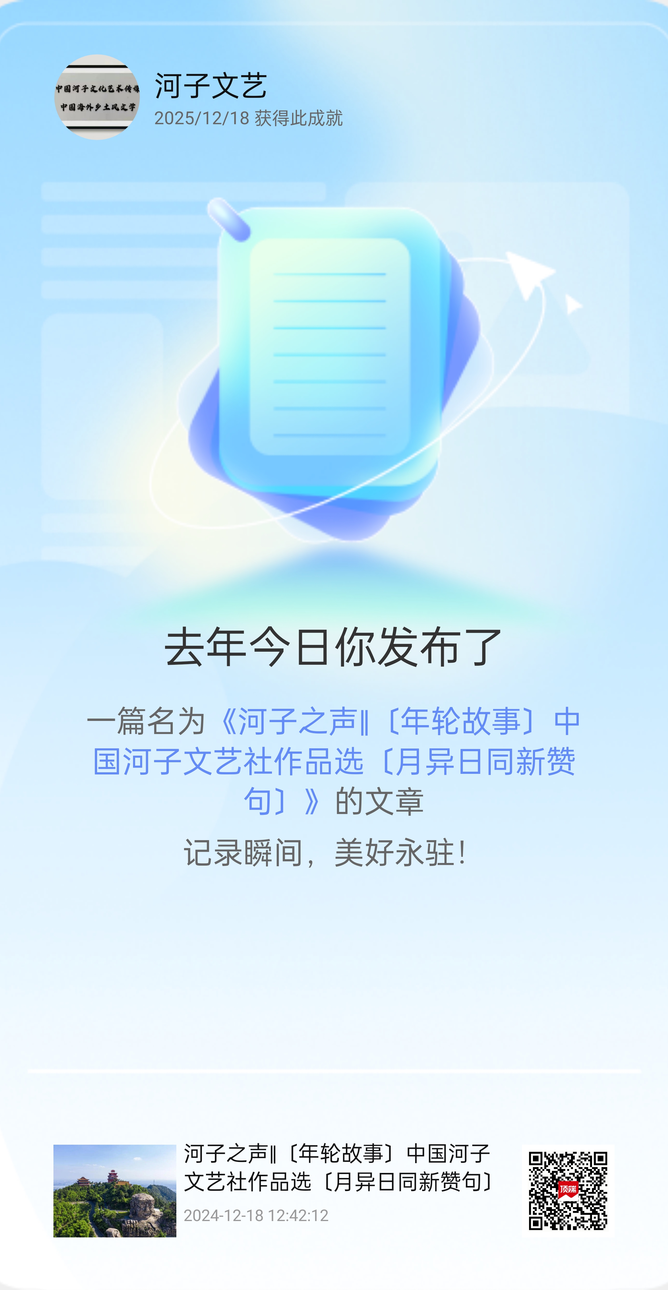 去年今日我在頂端發布了《河子之聲‖冰陽:遙寄瓊瑤,憶往昔時光》! 歲月熔煉才情,日子沉淀心聲!
