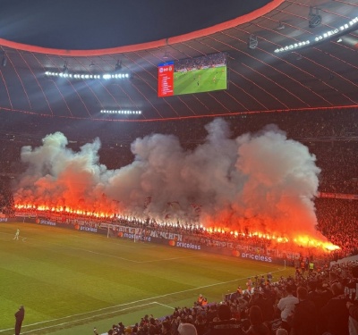歐冠聯賽階段第6輪比賽, 拜仁主場3-1擊敗 葡萄牙體育,拜仁極端球迷在比賽中燃放煙火。