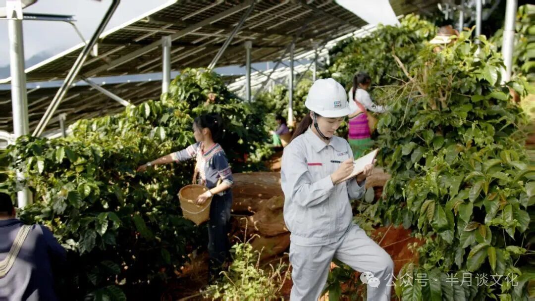 云南省普洱市,中電工程工程員工正在“咖光互補”光伏項目記錄咖啡樹數(shù)據(jù)、咖農采摘鮮果