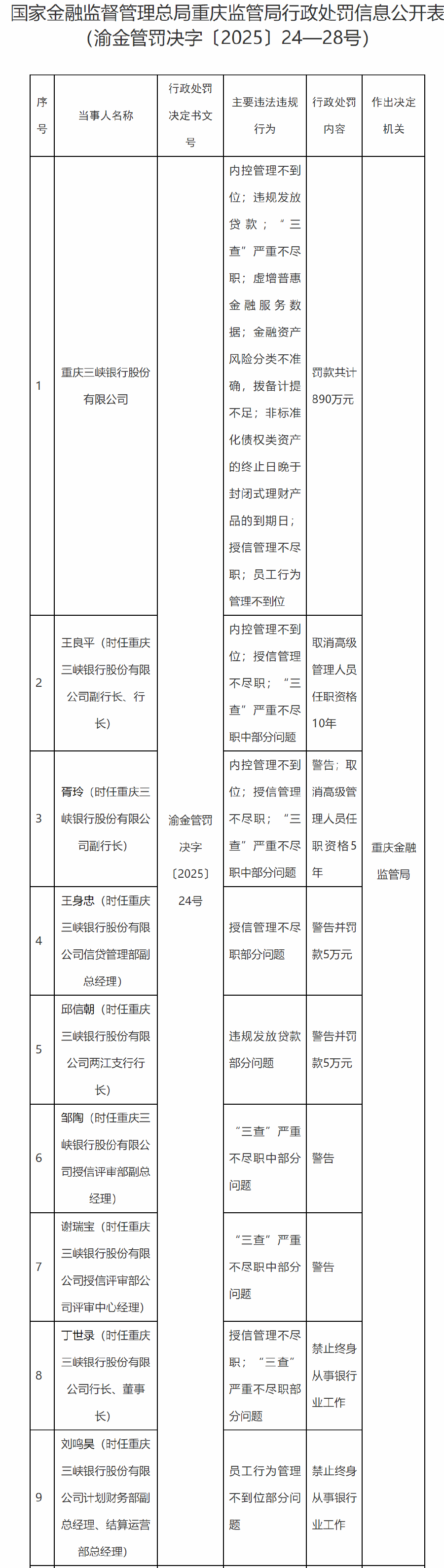 邱信朝,時任重慶三峽銀行兩江支行行長,因對違規發放貸款部分問題的違法違規行為負有責任,被警告并罰款5萬元;