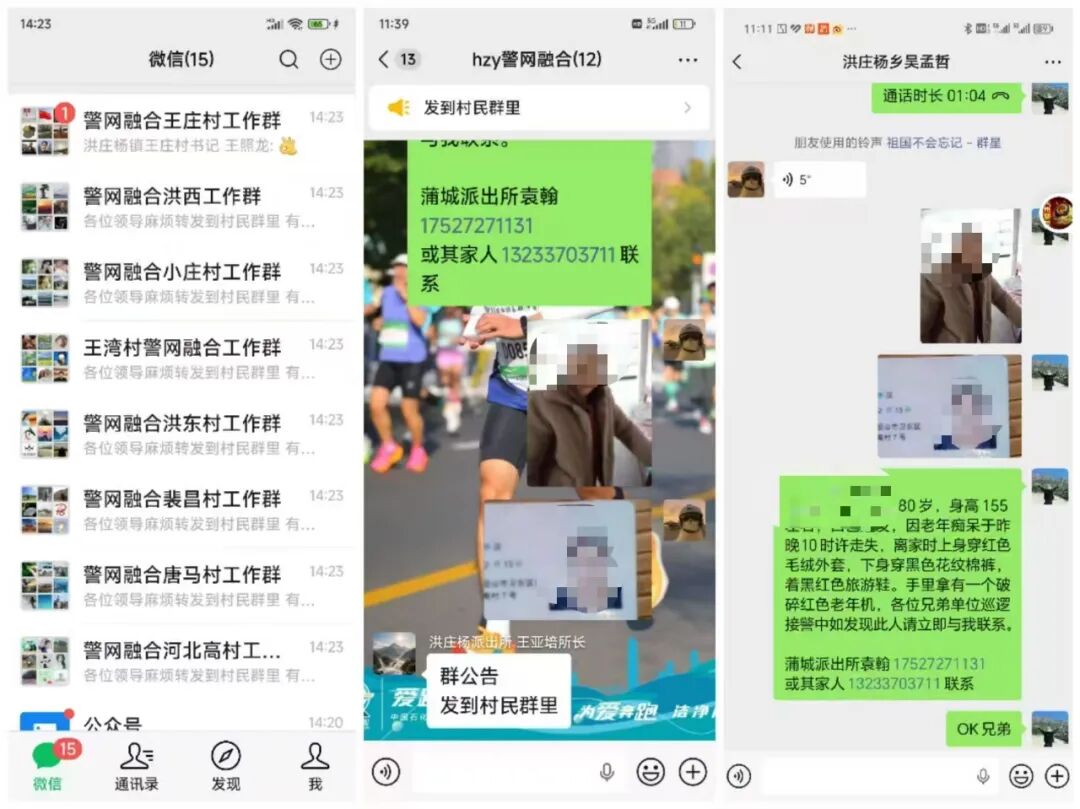 搜尋過(guò)程并非一帆風(fēng)順。由于老人走失時(shí)間長(zhǎng)、行動(dòng)軌跡不確定,且監(jiān)控覆蓋存在盲區(qū),前期搜尋工作一度陷入瓶頸。為打破僵局,民警重新調(diào)整搜尋策略,依托警網(wǎng)融合優(yōu)勢(shì),一方面對(duì)接臨近轄區(qū)派出所,擴(kuò)大監(jiān)控調(diào)取范圍,組織專人對(duì)監(jiān)控錄像進(jìn)行細(xì)致研判,最終發(fā)現(xiàn)老人向襄縣方向行走。另一方面,警網(wǎng)融合制度打破了信息孤島,將老人信息發(fā)往周邊轄區(qū)派出所,各個(gè)派出所即刻將老人信息同步到各個(gè)派出所轄區(qū)村民服務(wù)群中,使得搜尋范圍進(jìn)一步擴(kuò)大,形成“線上線下聯(lián)動(dòng)、轄區(qū)內(nèi)外覆蓋”的搜尋格局。