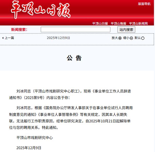 河南平頂山市戲劇研究中心近日在《平頂山日報》發布辭退公告稱,劉冰同志(平頂山市戲劇研究中心職工)長期失聯、無法履職,經單位研究決定,自2025年10月21日起解除單位與其的聘用關系。