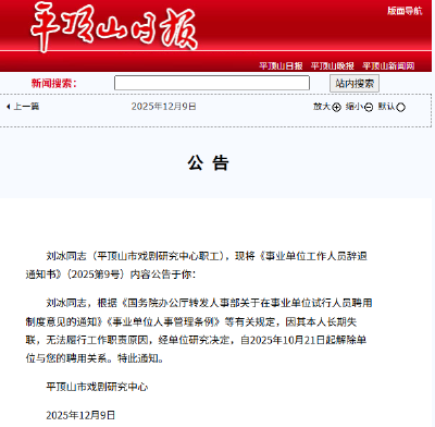 被辭退對象為平頂山市戲劇研究中心職工劉冰同志。公告稱:劉冰同志,根據《國務院辦公廳轉發人事部關于在事業單位試行人員聘用制度意見的通知》《事業單位人事管理條例》等有關規定,因其本人長期失聯,無法履行工作職責原因,經單位研究決定,自2025年10月21日起解除單位與您的聘用關系。特此通知。