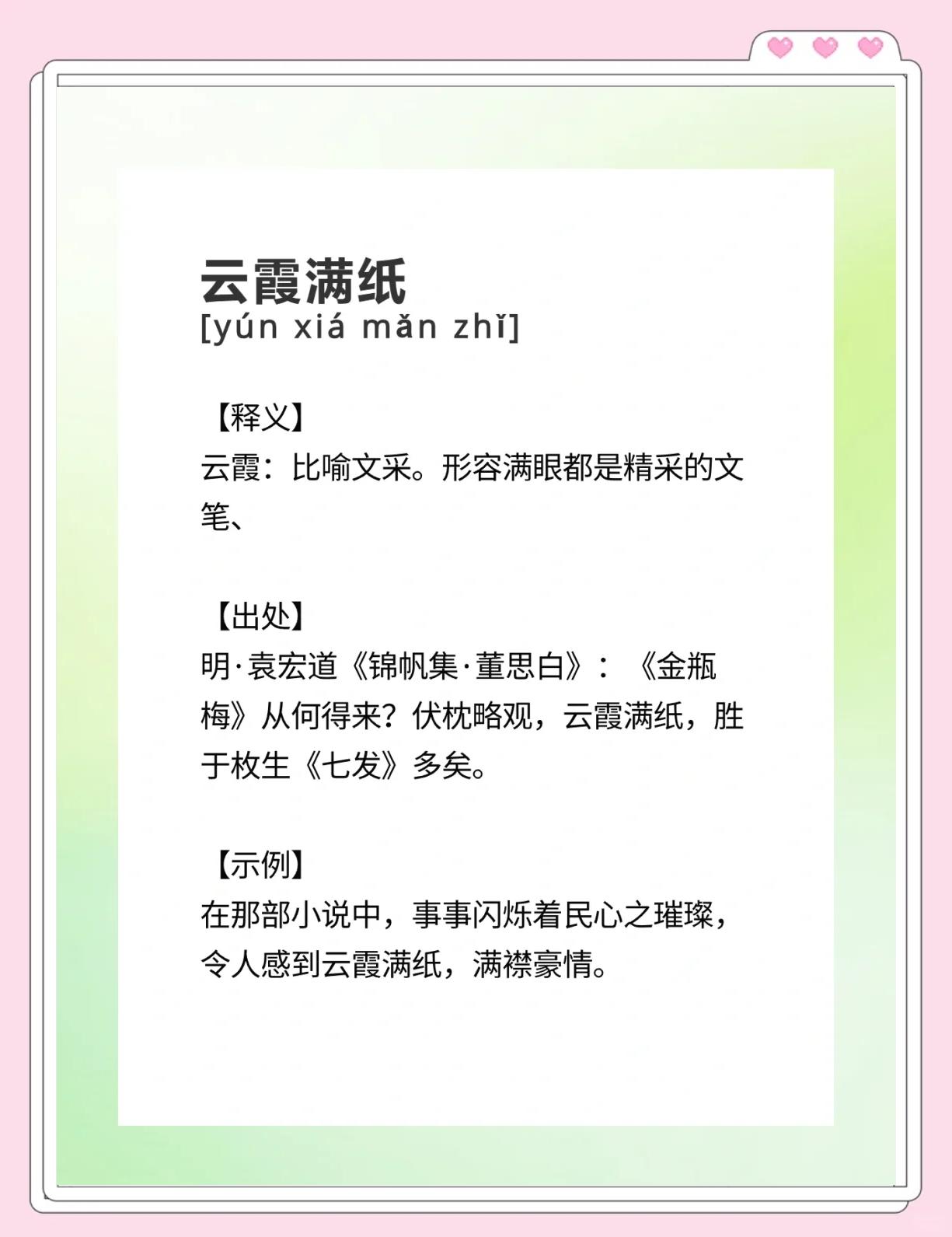 “云霞”作為文采比喻,淵源甚早。《文心雕龍·原道》已用“云霞雕色,有逾畫工之妙”來形容天地文章之美。唐代文章更是常以“云錦”、“霞蔚”喻文采。但將“云霞”與“滿紙”結合,形成對作品整體氣象的巔峰評價,袁宏道的這句贊語起到了關鍵作用,使其從一個描述性詞組,凝練為一個極具畫面感的成語。