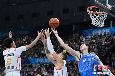 12月13日,在北京奧體中心體育館舉行的2025-2026中國男子籃球職業(yè)聯(lián)賽(CBA)常規(guī)賽比賽中,北京控股隊主場以97比92戰(zhàn)勝山東高速隊。圖為山東高速隊克里斯(白衣)在比賽中上籃。