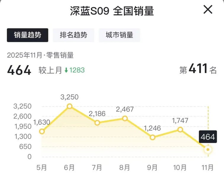 11 月銷量:464 輛,跌至三位數的慘淡成績,標志著這款高端戰略車型已陷入 “銷量與口碑雙崩盤”。