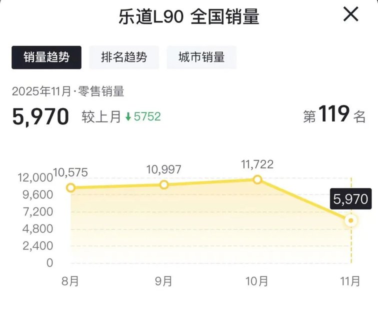 不過從品牌交付數據來看,樂道品牌 11 月共交付新車 11794 臺,樂道 L90 上市 4 個月累計交付量仍有 39319 臺。