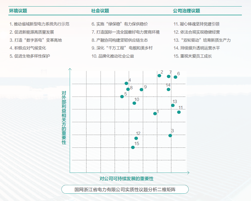 企業的ESG行動始于識別真正重要的議題。以國網浙江電力為例,公司結合2024年全球可持續發展趨勢與自身戰略方向,通過對各類潛在議題的科學分析與評估,公司構建了一個實質性議題分析二維矩陣,最終從環境、社會、公司治理三大領域中,識別并聚焦于15項實質性議題。