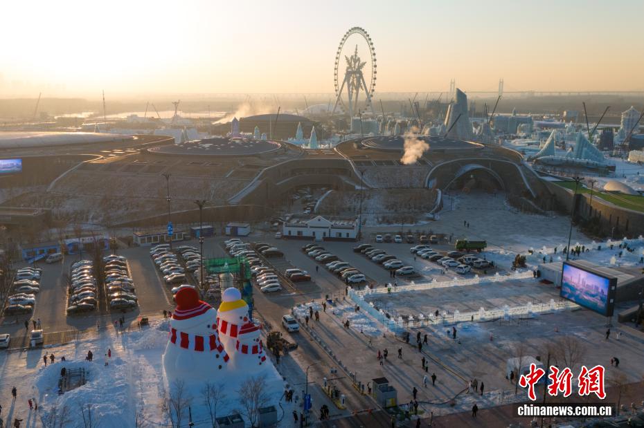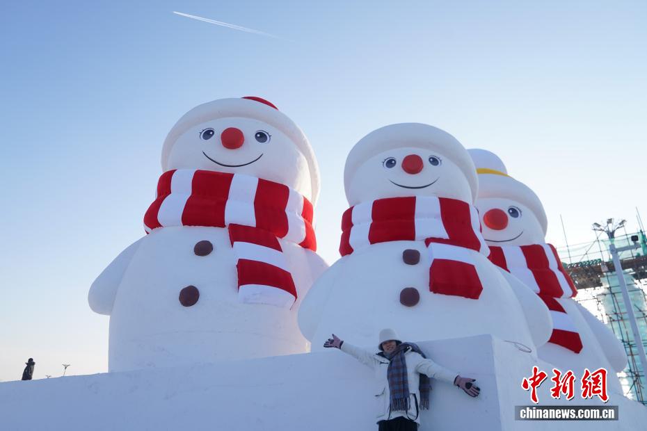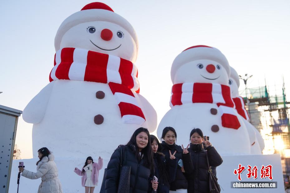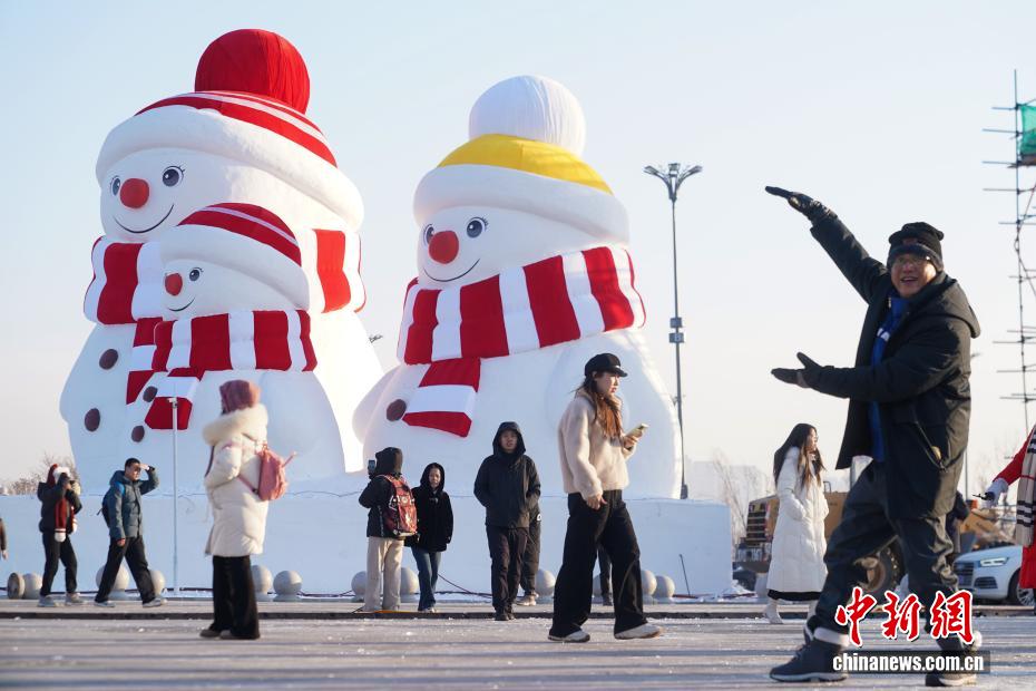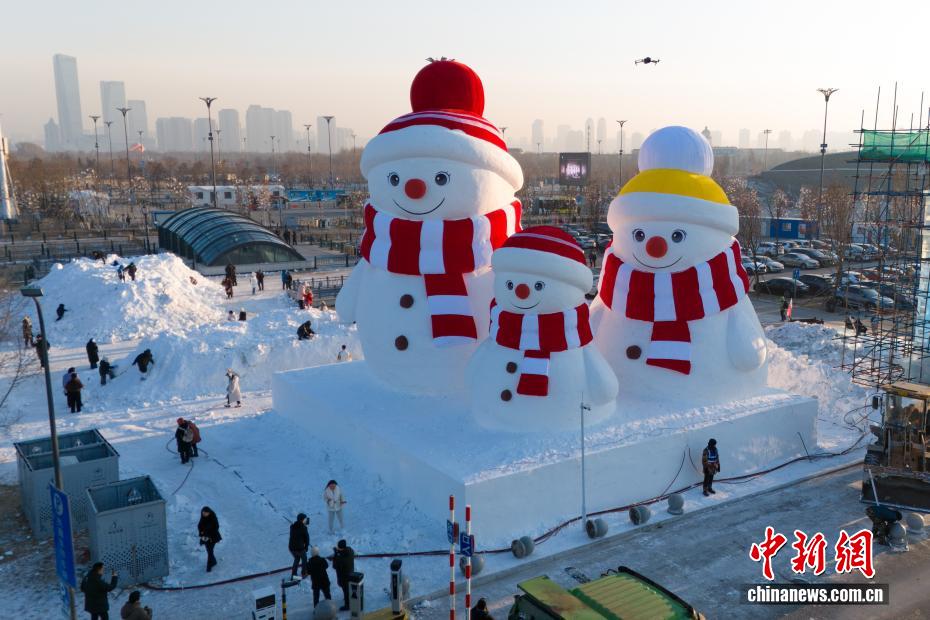 12月13日,黑龍江哈爾濱,雪雕“童話雪人一家”吸引游客打卡,遠處為正在建設(shè)中的冰雪大世界。據(jù)了解,第二十七屆哈爾濱冰雪大世界“迎賓先行者”“童話雪人一家”高15米,用雪量近4000立方米,于日前完成雕刻。雪人一家三口戴上了帽子和圍巾,在冰雪的映襯下盡顯喜慶溫暖。(無人機照片)