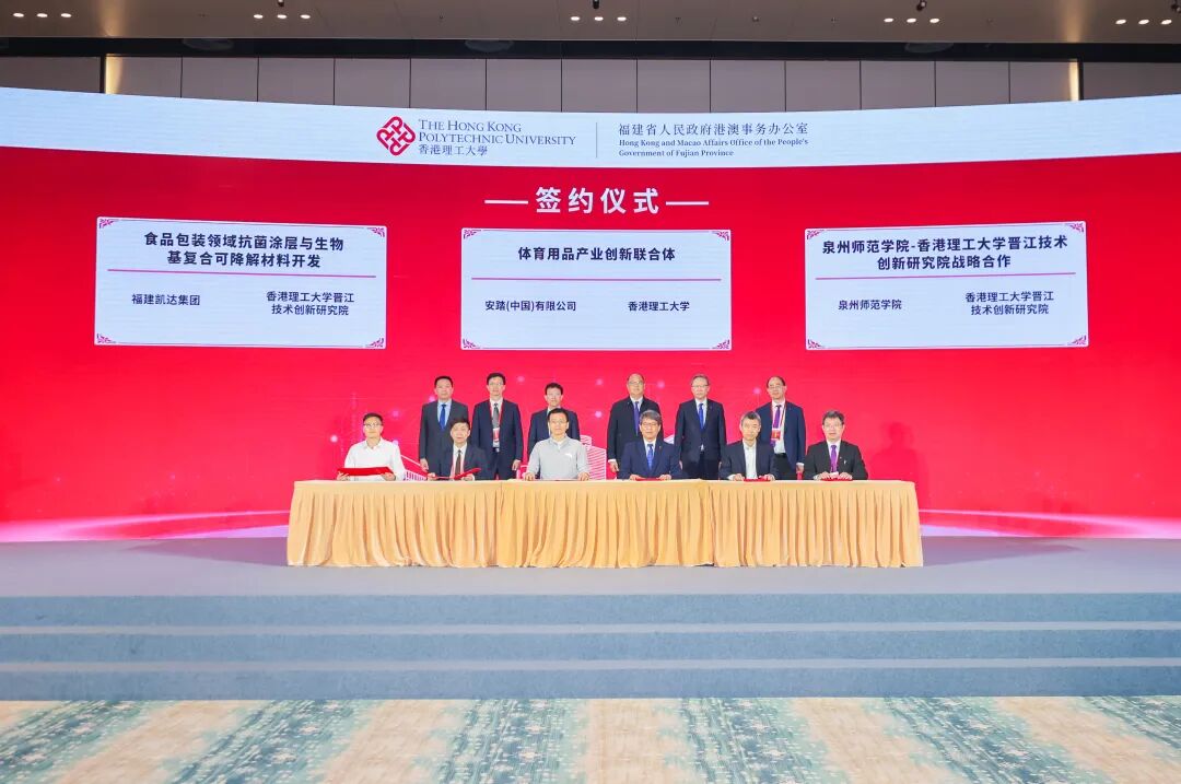 大會簽約環節亮點突出,達成多項合作。其中,香港理工大學與安踏集團正式簽約;香港理工大學晉江研究院分別與盼盼集團、泉州師范學院、凱達集團、晉江新絲路康養產業有限公司及晉江護理學會達成合作;晉江產業投資集團與安萊光電科技有限公司完成簽約。