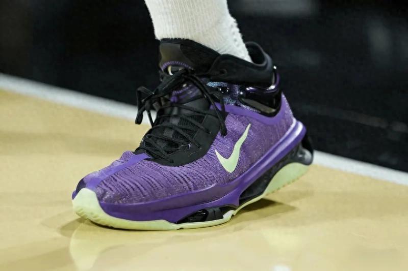 值得一提的是,比賽中唐斯腳上的戰靴吸引了眾多球迷的目光。他上腳了一雙紫色的Nike G.T Jump2 PE。這種專為球員定制的球員專屬版(PE)戰靴,通常在設計上會融入球員的個人元素,同時在性能上也會根據球員的特點進行優化。紫色的外觀十分亮眼,與唐斯在賽場上的精彩表現相得益彰。在激烈的比賽中,這雙戰靴為唐斯提供了穩定的支撐和良好的緩震性能,幫助他在賽場上自如地奔跑、跳躍和投籃,成為了他在球場上的得力助手。