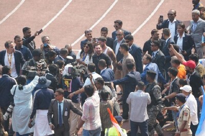 梅西等人抵達(dá)孟買球場(chǎng),梅西與印度傳奇球星切特里握手致意