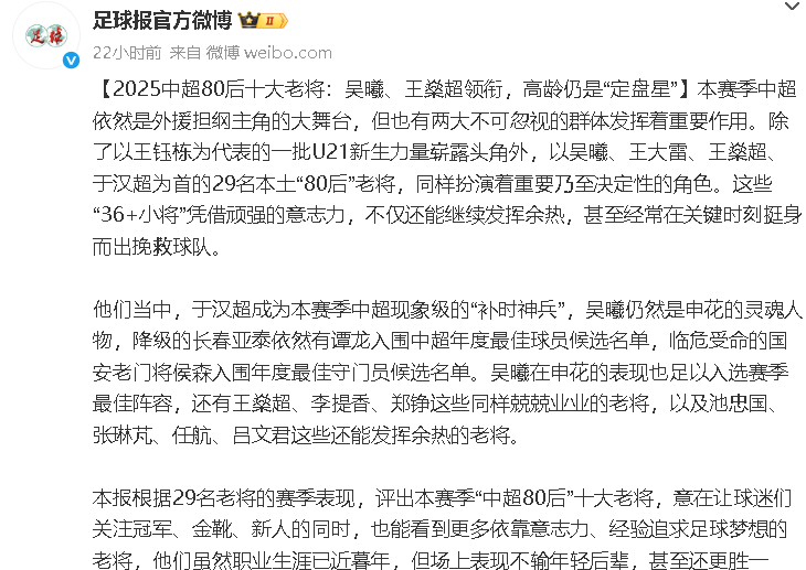 “外援耀眼,小將冒尖,可80后老將才是中超最穩的‘定海神針’!”??2025賽季中超,外援和U21小將搶盡風頭,但一群36歲左右的“80后老炮兒”卻用實力搶鏡。于漢超補時絕殺,吳曦盤活中場,譚龍進球比外援還多,誰說老將不行了?老將們靠啥立足?經驗、自律、態度!吳曦場均搶斷2.8次,傳球成功率89%,這數據年輕球員得追趕。球隊別光盯著外援,老將的傳幫帶作用無可替代。看著老將們在場上拼搏,心里那叫一個敬佩!年齡不是界限,熱愛和努力才是王道。下賽季,這些老炮兒還會帶來啥驚喜?評論區聊聊,你覺得哪位老將最能“打”???#2025新星計劃4期##2025頂端人氣創作者 ##創作挑戰賽十一期#