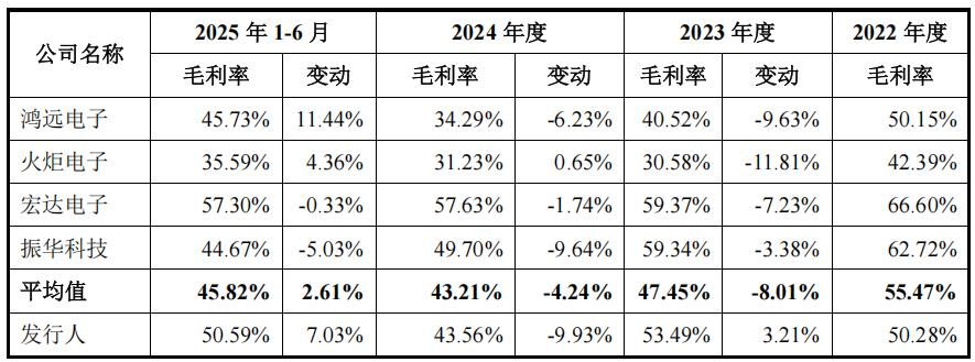 2022年-2025年1-6月,公司綜合毛利率分別為50.28%、53.49%、43.56%和50.59%。其中,電子元器件業務毛利率分別為67.91%、65.83%、54.90%和58.52%,精密零組件業務毛利率分別23.26%、22.67%、19.69%和25.16%。宏明電子精密零組件產品毛利率2024年下滑主要系當期因產品質量問題導致客戶質量索賠,進而調減收入所致。