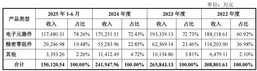 2022年-2025年1-6月,宏明電子精密零組件產品的收入占比分別為36.98%、23.46%、22.85%和19.48%,收入占比持續下降。對于精密零組件業務經營業績整體呈下降趨勢,公司稱主要原因系:2023年,受下游消費電子市場需求放緩的影響,終端客戶蘋果公司的產品需求下滑;受終端客戶蘋果公司產業鏈外移影響,公司下游客戶在越南、泰國、印度、巴西等地擴建工廠,中國大陸的部分產能被轉移,而公司未及時配合進行海外建廠,導致部分訂單被其他能夠配合海外建廠的競爭對手所分流。蘋果產業鏈外移進程預計需要較長時間,經營業績預計將持續受到影響。