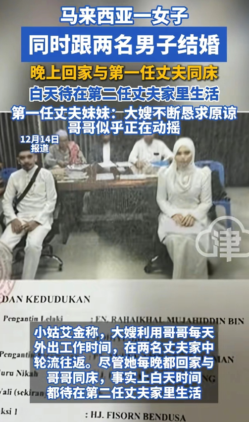 “不服不行”,馬來西亞一女子同時和兩名男子結婚,晚上和第一個丈夫一起睡覺,白天又跑到第二個丈夫家里生活,一來一去竟然沒有一個人發現。