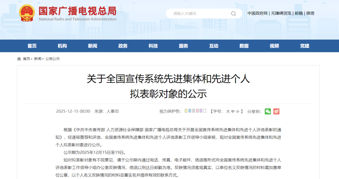 12月15日,國家廣播電視總局官網發布《關于全國宣傳系統先進集體和先進個人擬表彰對象的公示》,對擬表彰的共291個先進集體、682名先進個人進行了公示。