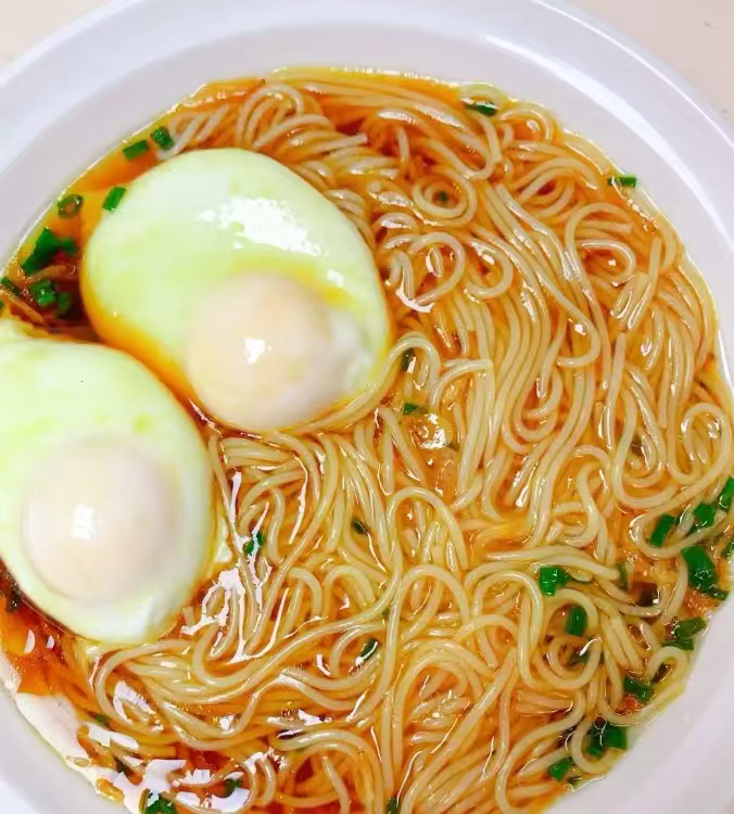 準(zhǔn)備一個大碗,放蔥花,豬油、生抽2勺、老抽少許、胡椒粉適量、醋1勺、蝦皮,倒入煮面的湯,再將煮好的面條撈入碗中,再放入提前煮好的荷包蛋。