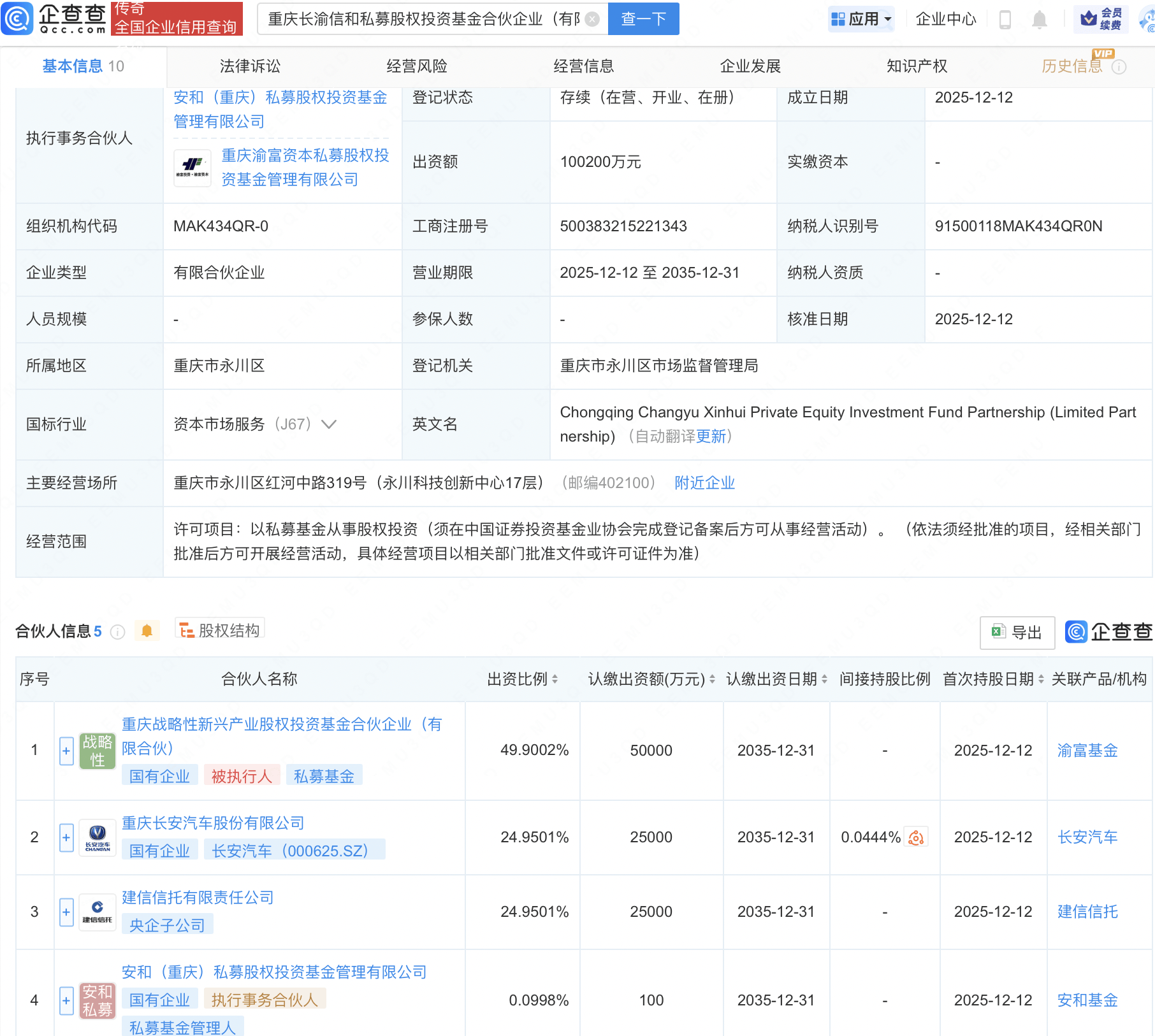企查查APP顯示,近日,重慶長渝信和私募股權投資基金合伙企業(有限合伙)成立,出資額10.02億元,經營范圍包含:以私募基金從事股權投資。企查查股權穿透顯示,該企業由長安汽車(000625)、建信信托有限責任公司等共同出資。