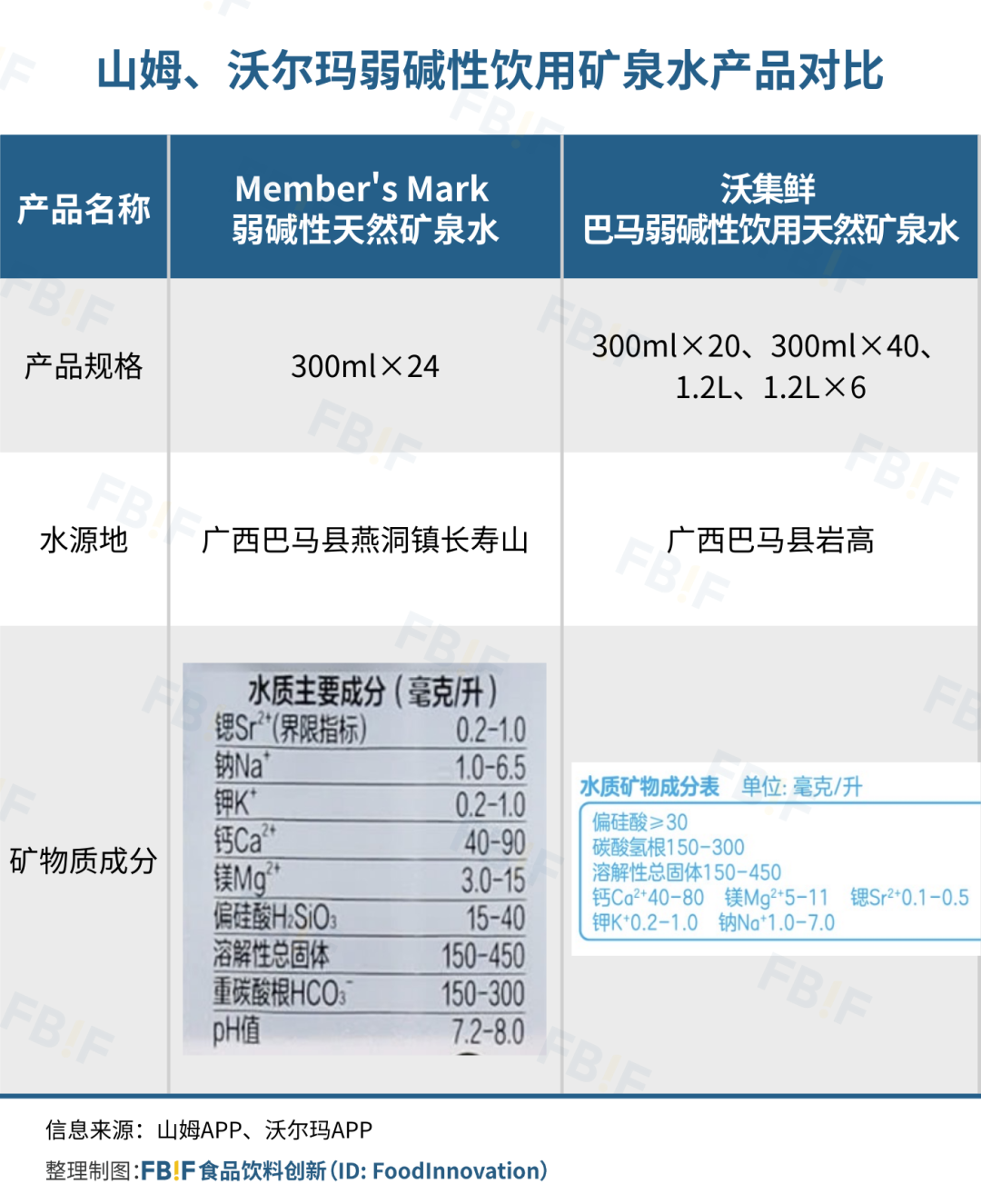 如今,在沃爾瑪的貨架上,也能看到與之相似的產品「沃集鮮巴馬弱堿性飲用天然礦泉水」。