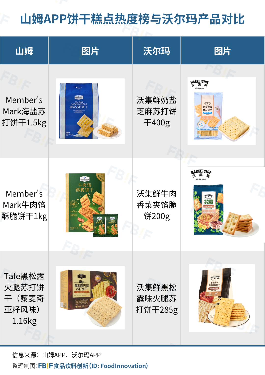 當然,這些產品并非1:1復刻。例如山姆的是“海鹽蘇打餅干”,而沃爾瑪則是“奶鹽芝麻蘇打餅干”,在口味和定位上做了微調。
