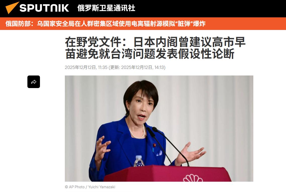 12月12日,俄羅斯衛星通訊社的一篇報道顯示,日本在野黨立憲民主黨成員公布了一份文件,還原了日本首相高市早苗發表涉臺錯誤言論,引發中日風波背后的真相。