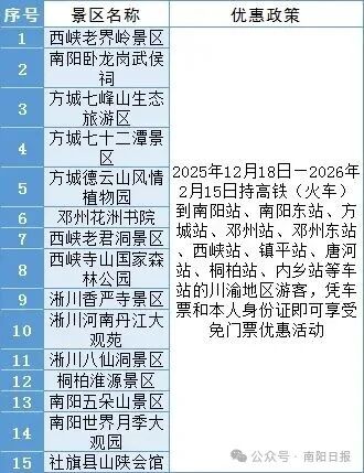2025年12月18日—2026年2月15日持高鐵(火車)票到南陽站、南陽東站、方城站、鄧州站、鄧州東站、西峽站、鎮(zhèn)平站、唐河站、桐柏站、內(nèi)鄉(xiāng)站等車站的四川、重慶地區(qū)游客,憑車票和本人身份證即可到指定景點享受免門票優(yōu)惠活動。