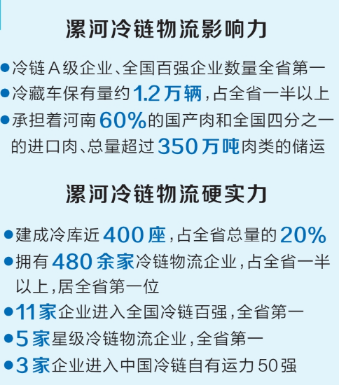 在雙匯的帶動下,一批本土冷鏈企業迅速成長。如今,漯河擁有480余家冷鏈物流企業,占全省一半以上,居全省第一;累計11家企業進入全國冷鏈百強,居全省第一;星級冷鏈物流企業5家,居全省第一;全省3家進入中國冷鏈自有運力50強的企業均在該市。