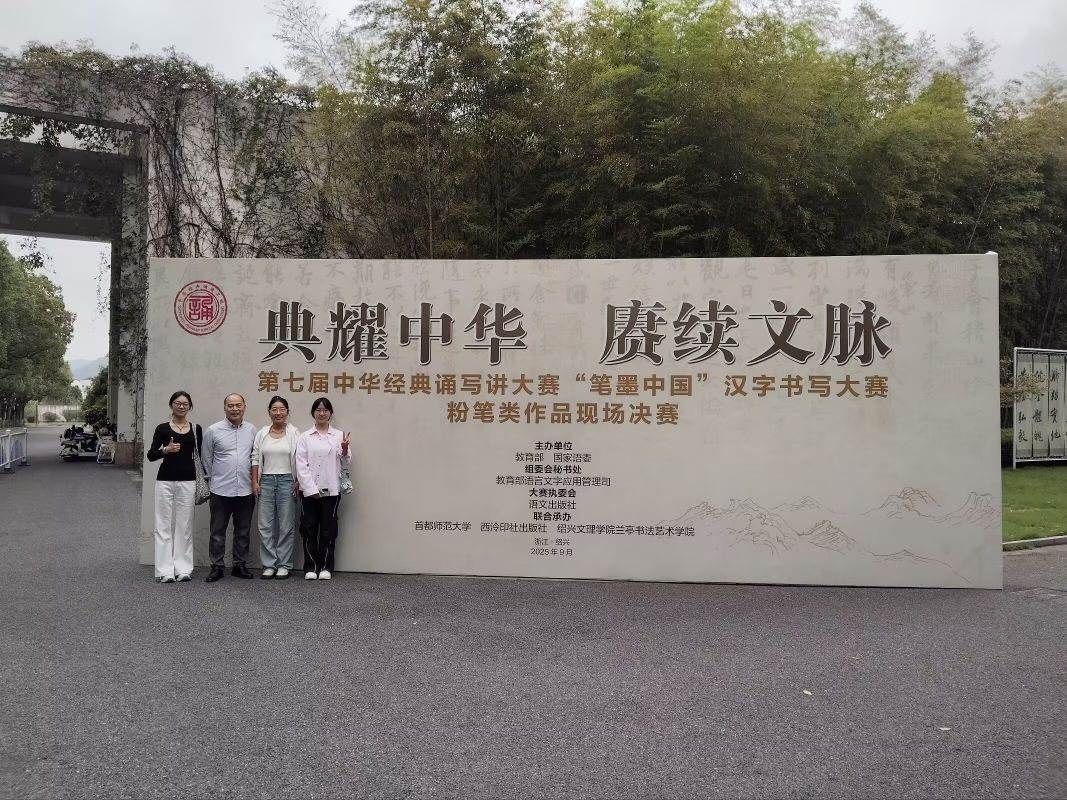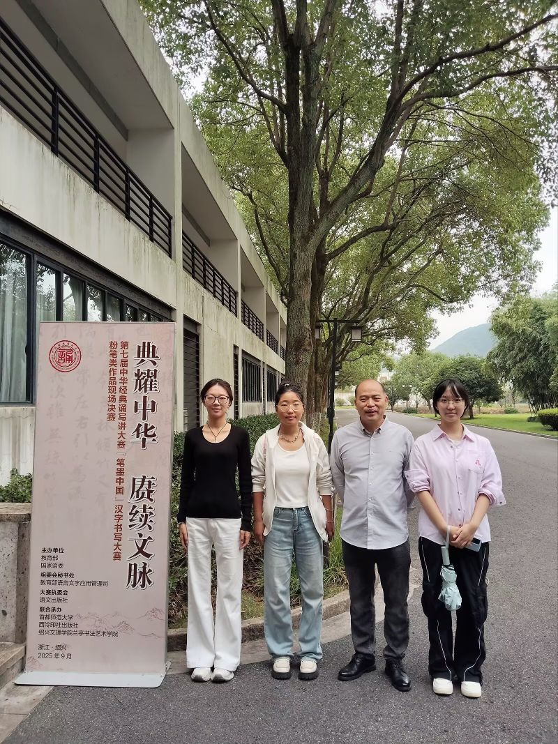 9月,決賽在浙江紹興蘭亭書法藝術學院隆重舉行,這里作為書法圣地,為賽事增添了濃厚的文化氛圍。孫文周老師與韓婉玉、尤幸浩、陳春源三位同學代表河南省赴現場參賽,其中河南省受邀參加師范院校學生組現場決賽的4名選手里,3人來自洛師文學院,占比高達75%。比賽現場,師生們凝神靜氣、揮毫潑墨,在方寸筆端間展現漢字之美,既彰顯了扎實的書寫功力,也流露著從容自信的競技心態,贏得了評委的高度認可。