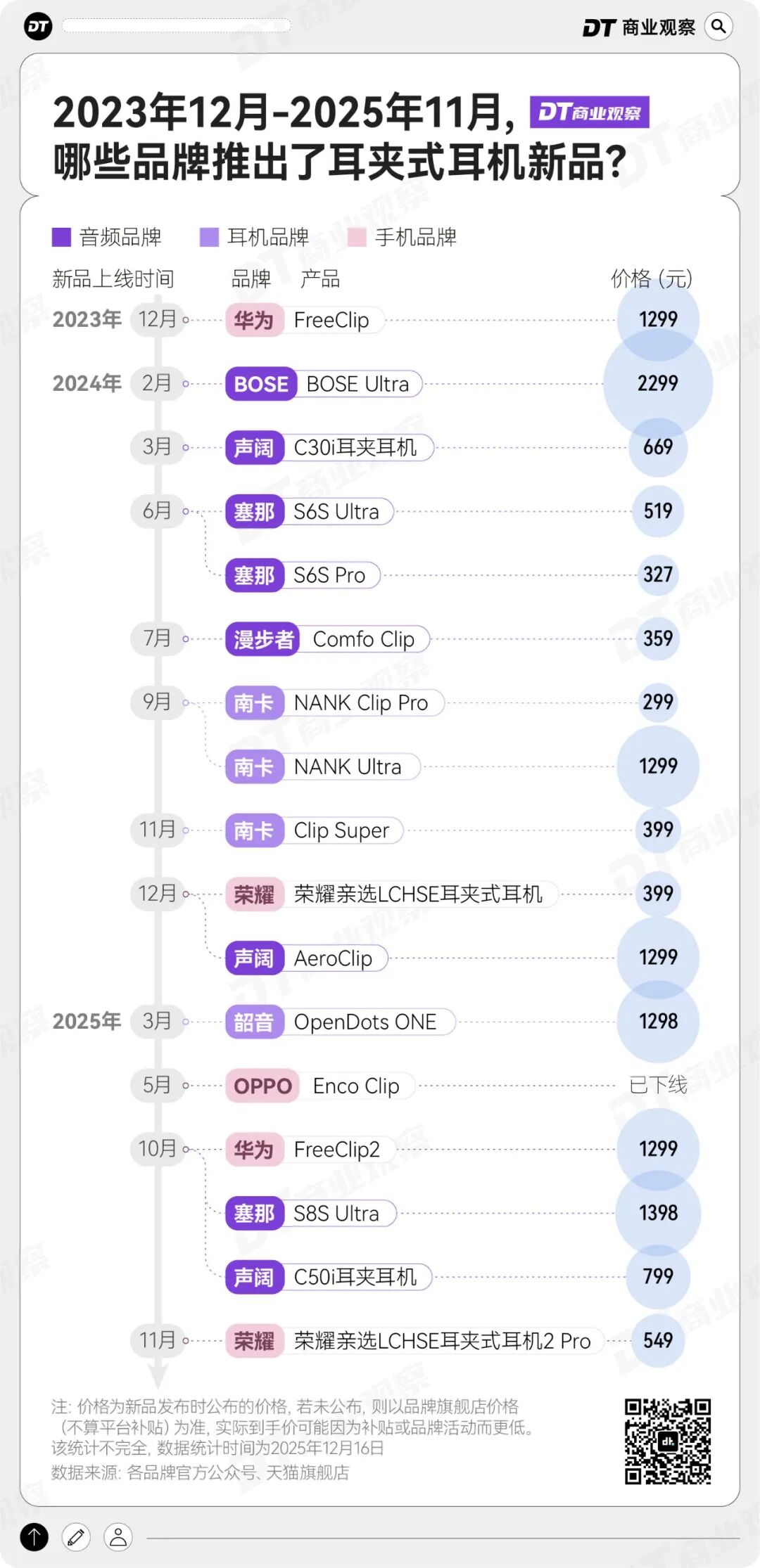 華為FreeClip的成功,讓耳夾式耳機(jī)的市場潛力徹底爆發(fā),各領(lǐng)域品牌紛紛入場,除了卷技術(shù)、重量、續(xù)航、顏值等等,價格段也變得更豐富了,這加速了耳夾式耳機(jī)從小眾嘗鮮走向大眾日常。