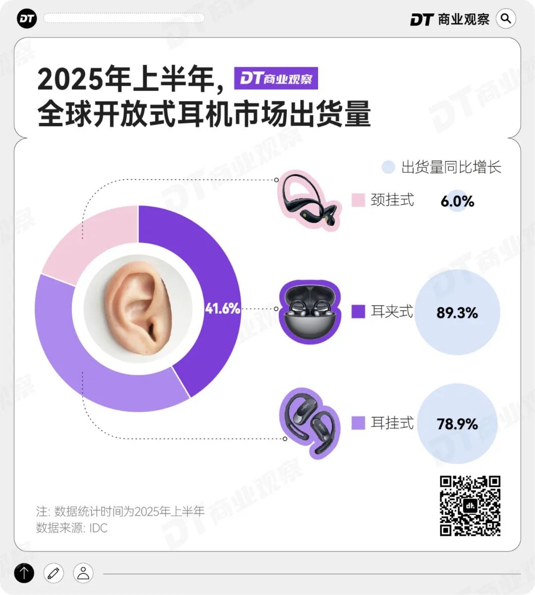 IDC數(shù)據(jù)顯示,2025年上半年全球開放式耳機(jī)出貨量同比增長61.1%。其中,最年輕的耳夾式耳機(jī)出貨量占比41.6%,同比增長89.3%,不僅跑贏大盤,也跑贏了耳掛式耳機(jī)(78.9%)和頸掛式耳機(jī)(6.0%)。