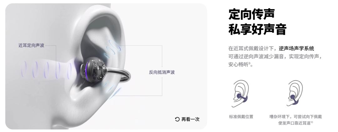 比如針對開放式耳機(jī)“容易漏音、泄露隱私”的痛點,三款耳機(jī)都使用了“定向傳聲”技術(shù),這種技術(shù)可以將聲音能量集中在一個狹窄的波束里,類似手電筒的光束,將聲音精準(zhǔn)傳輸?shù)接脩舳览?,減少聲音向周圍環(huán)境泄露。