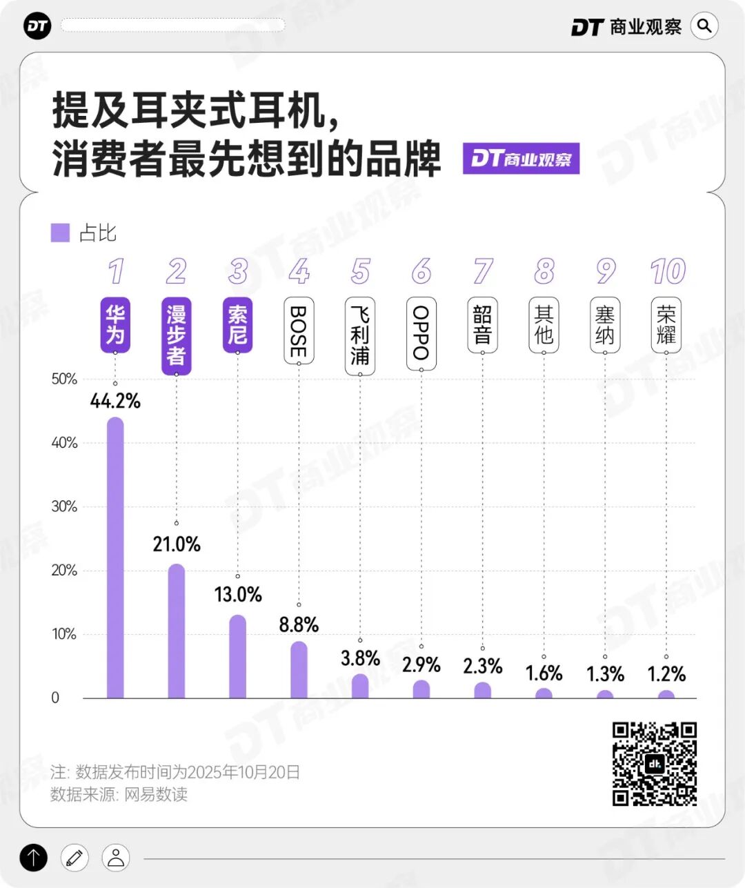 2025年10月,網(wǎng)易數(shù)讀發(fā)布的一則數(shù)據(jù)顯示,提到耳夾式耳機(jī),44.2%的消費者最先想到的品牌就是華為,這意味著華為已經(jīng)將品牌與“耳夾式耳機(jī)”這一品類深度綁定,完成了關(guān)鍵的市場教育。