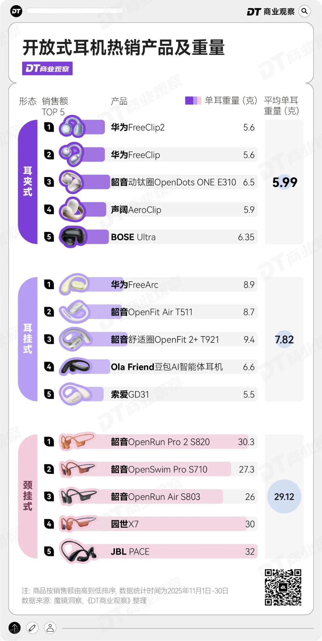 在重量上,耳夾式耳機(jī)也比頸掛和耳掛式更輕,更容易讓消費者體驗到“無感佩戴”。