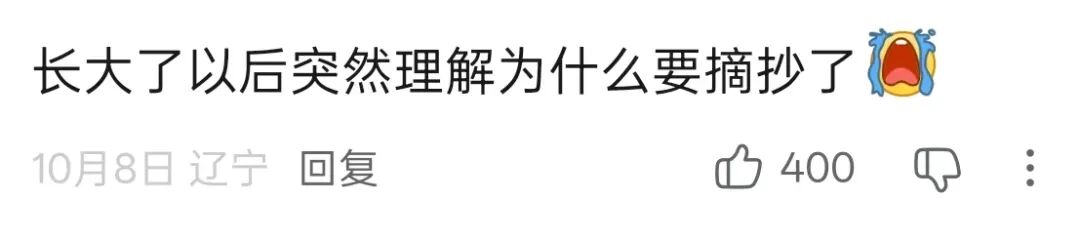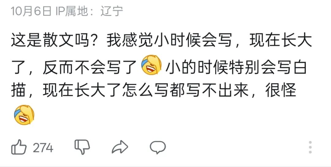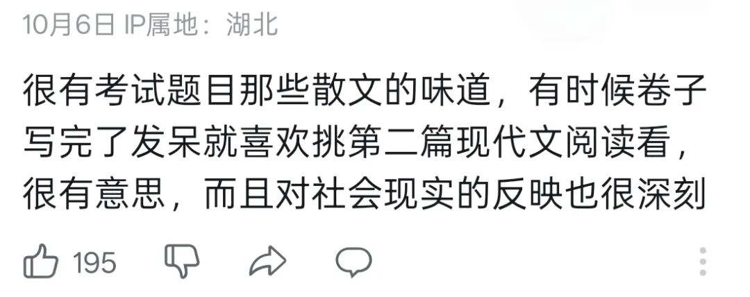 有網(wǎng)友在她的文字里,看見了語文教科書的影子。大家還主動(dòng)在評論區(qū)給她的文章出閱讀理解題,一句“表達(dá)了作者的思鄉(xiāng)之情”,帶著成長的幽默之余,也讓人仿佛回到學(xué)生時(shí)代讀文章的那份質(zhì)樸。