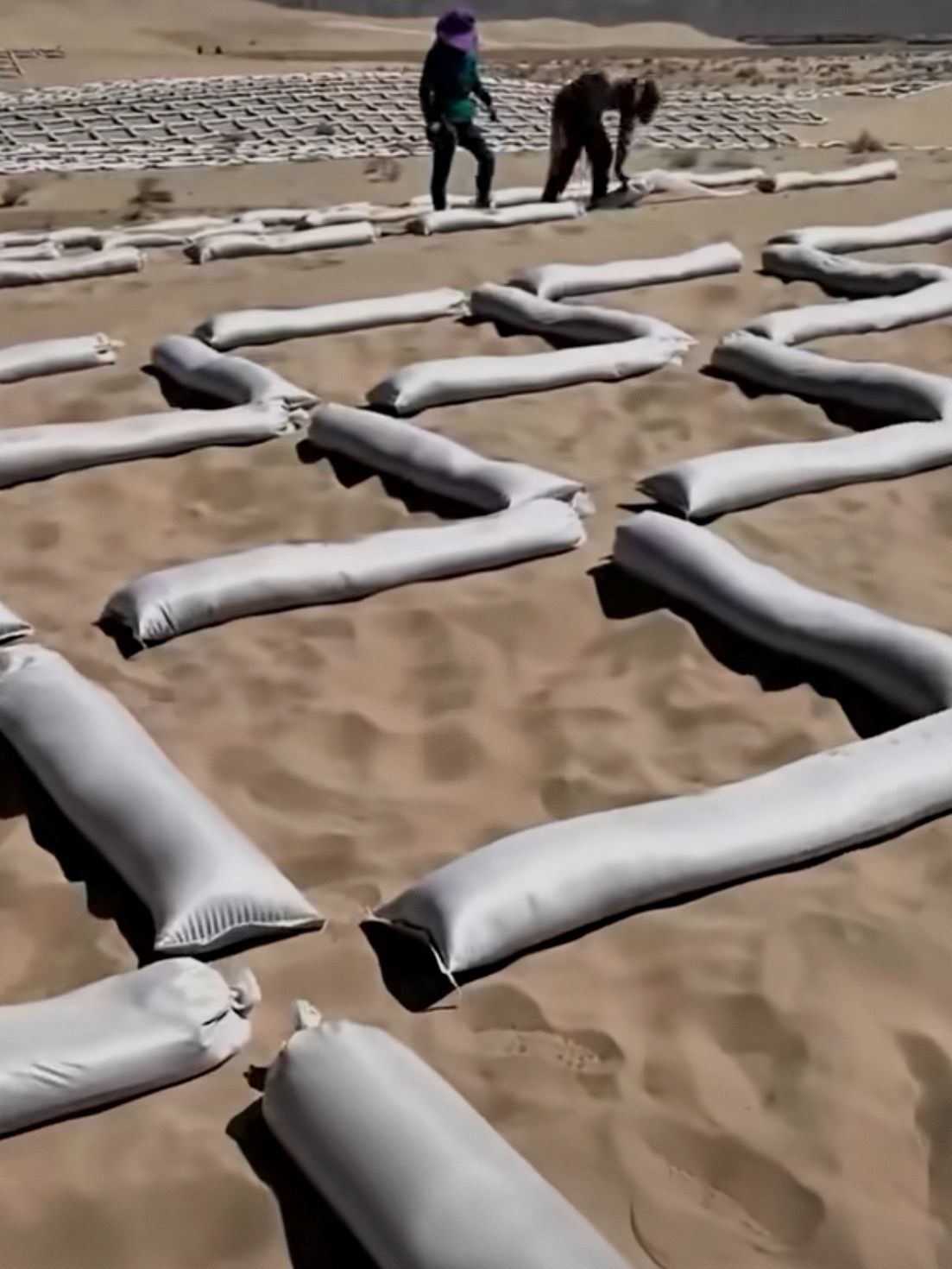 過去,人們用草方格固沙,將麥草扎進沙層,形成網格狀的屏障。如今,可降解的尼龍袋沙障成為新選擇。治沙人將沙子裝入圓筒形的袋子里,壘成方格,每一個沙袋都像一個“溫柔的懷抱”,將流動的沙粒牢牢固定。這種“以沙治沙”的方法,不僅有效阻擋沙粒前進,還能在沙袋間積蓄水分,為植物生長創造條件。