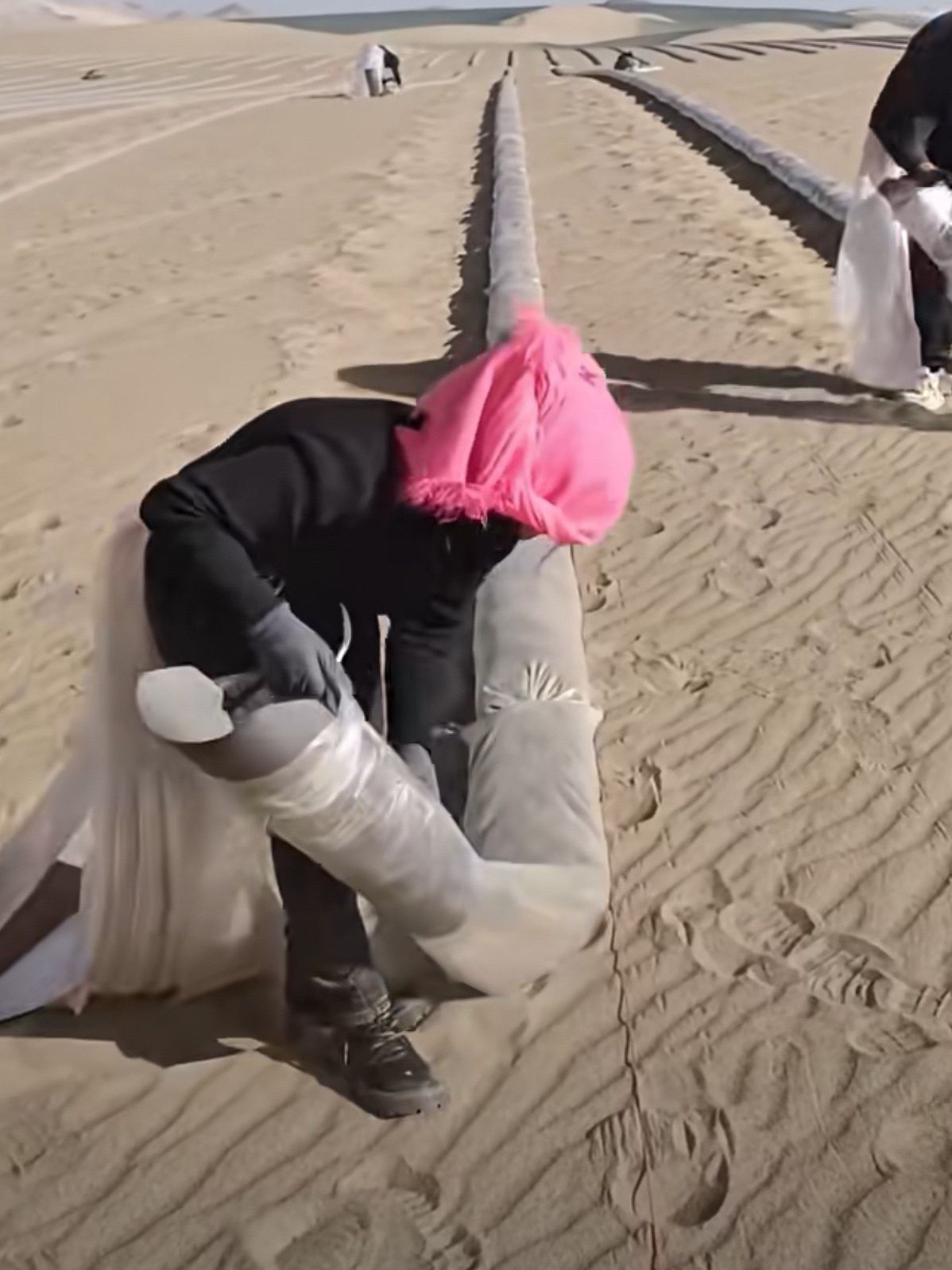 鏡頭中,治沙人們戴著頭巾,穿著厚實的衣物,在烈日下忙碌著。他們的手上沾滿沙塵,額頭上滲出汗水,卻依然專注地將沙袋擺成整齊的方格。有人說:“沙漠防沙是一項長期的工程,也許需要幾代人的努力才能變成綠洲。”而這些治沙人,正是用“一輩子只做一件事”的倔強,將綠色種進沙漠。