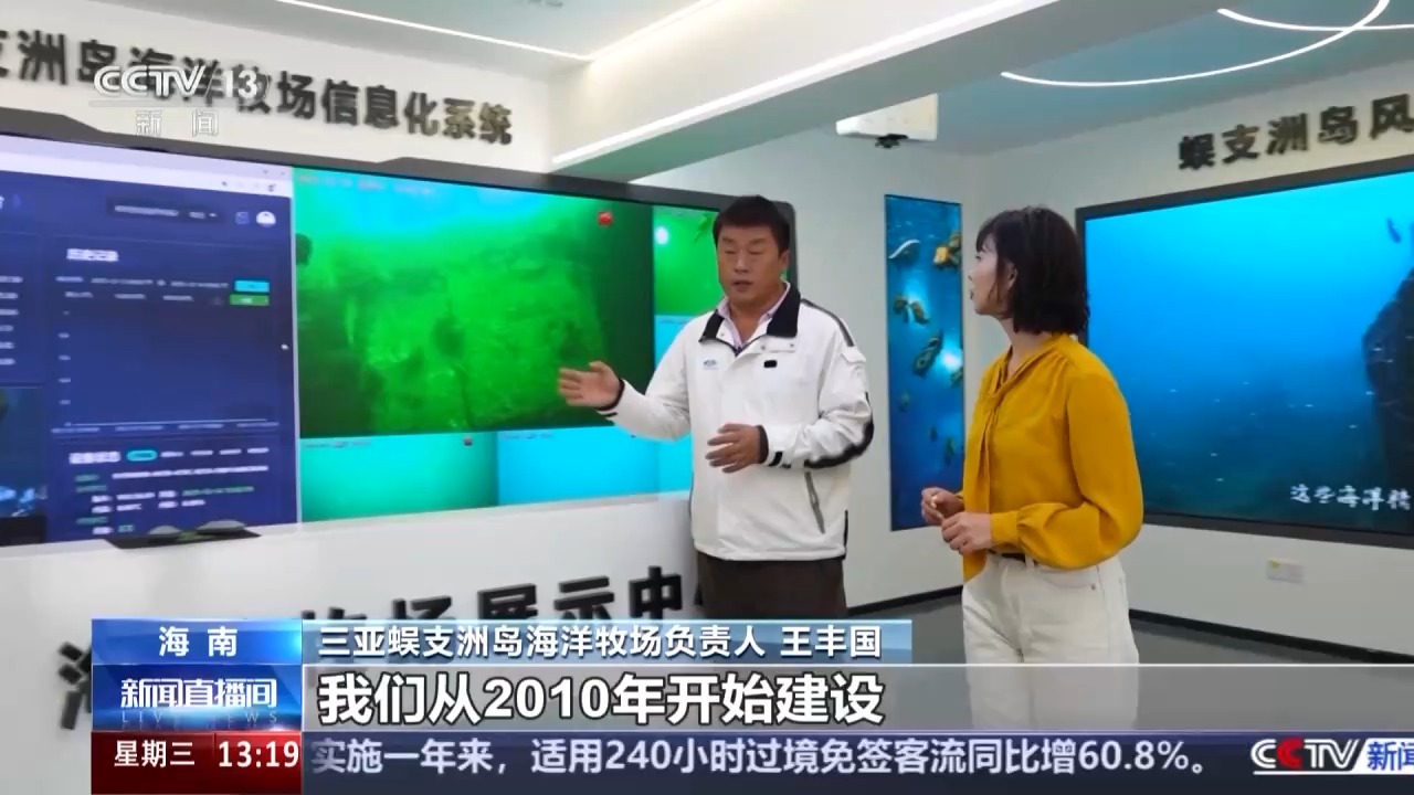 海南三亞蜈支洲島海洋牧場負責人 王豐國:目前我們所處的位置就是蜈支洲島海洋牧場信息化展示平臺。我們從2010年開始建設蜈支洲海洋牧場,珊瑚的覆蓋率由15%左右提升到37.08%。看到一片荒漠慢慢被珊瑚覆蓋,這種感覺一個字“爽”。