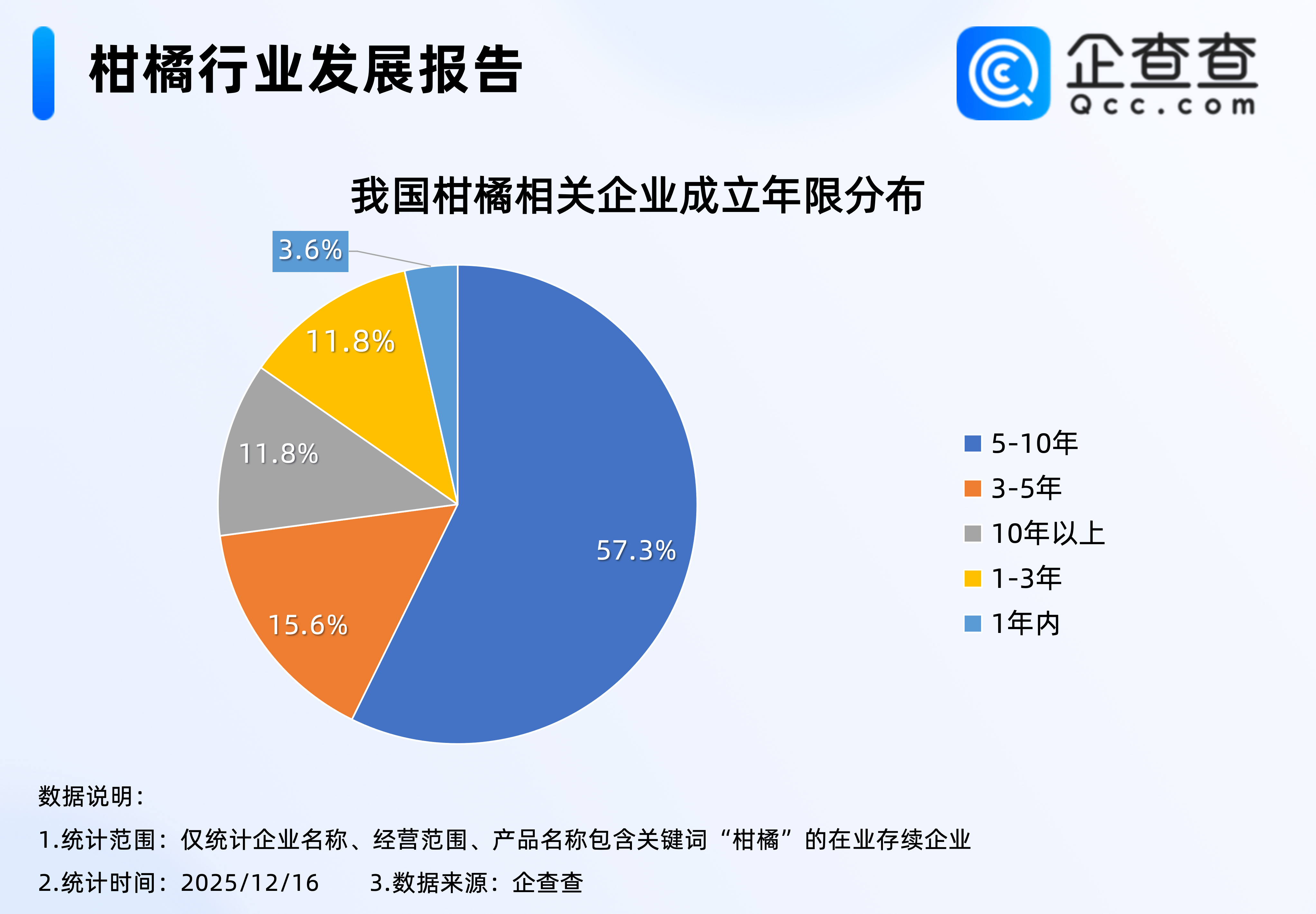 企查查數據顯示,成立年限方面,我國柑橘領域以老牌企業為主,近七成企業成立超5年,其中成立10年以上的企業占比11.8%,成立5至10年之間的企業占比57.3%。