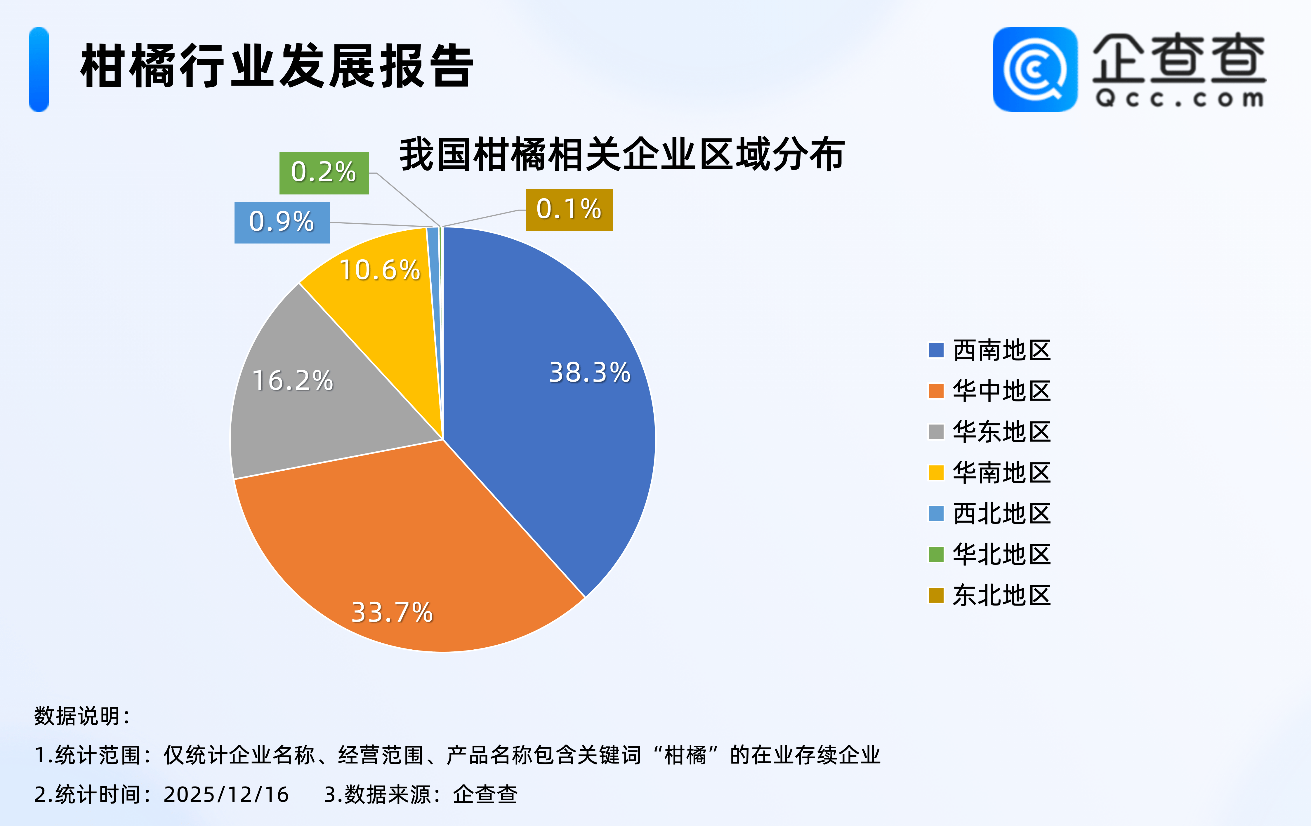 企查查數據顯示,我國柑橘相關企業集中西南地區,占全國總存量的38.3%,其次是華中地區,占比33.7%,華東和華南地區分別占比16.2%、10.6%。