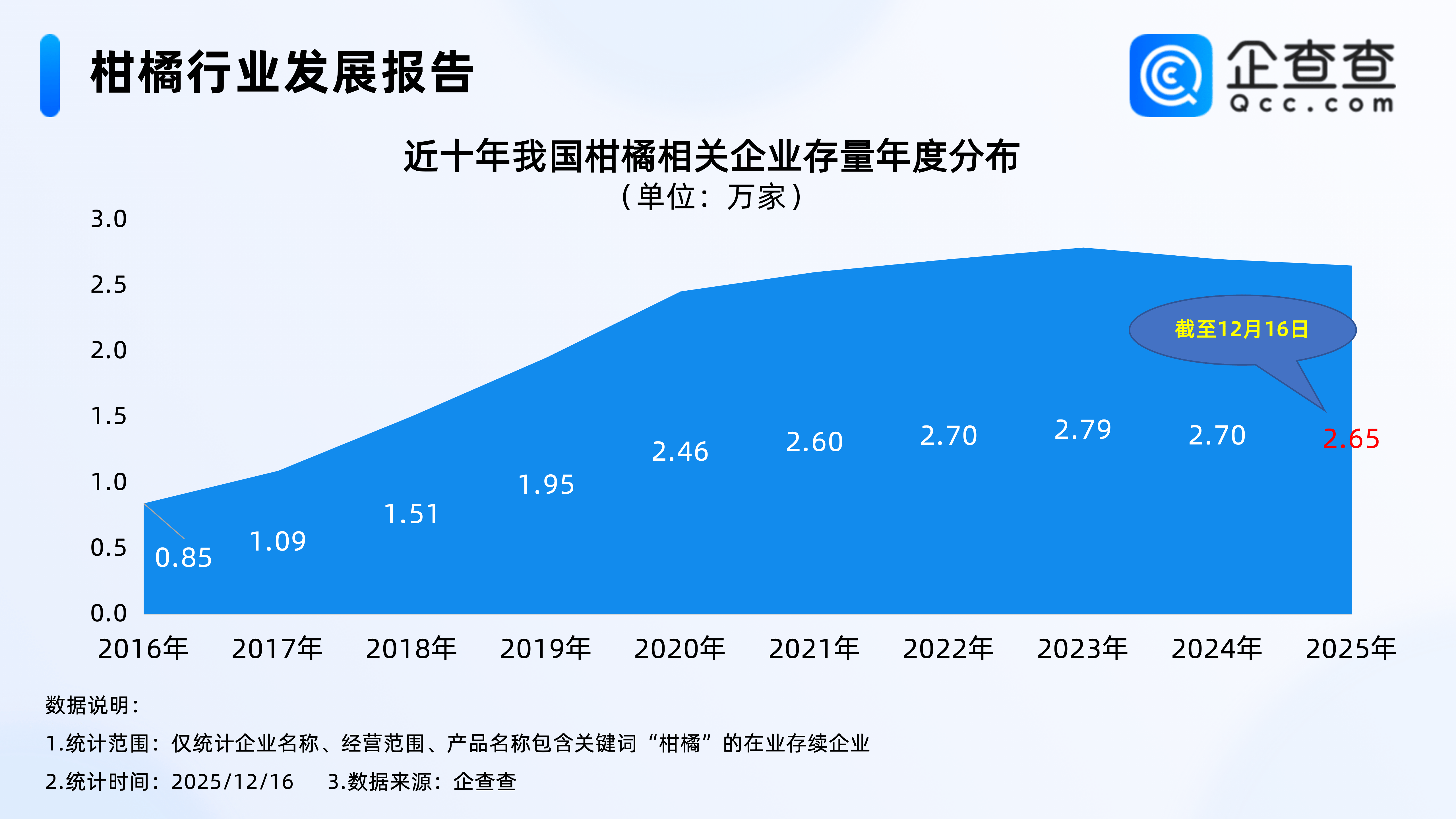 企查查數據顯示,2016年開始,我國柑橘相關企業存量快速增加至2020年的2.46萬家,截至2023年年底,國內相關企業存量達2.79萬家。至此,我國柑橘相關企業存量達到近十年峰值。經過2024年的調整,截至12月16日,我國現存2.65萬家柑橘相關企業。