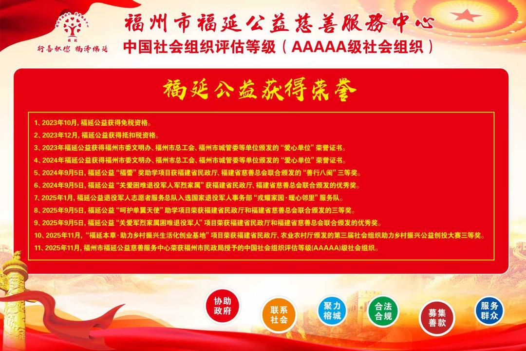 作為2023年2月7日成立的公益力量,福延公益在福州市民政局和中共福州市社會組織綜合黨委的指導支持下,秉持“行善積德 福澤綿延”的理念,扎根有福之州,迅速成長為區域內極具影響力的慈善標桿。2025年11月,中心被福州市民政局評為5A級社會組織,其公益專業性、公信力與規范化運營水平躋身行業前列。自成立以來,中心由7位愛心人士發起,已匯聚1500家愛心企業、壯大志愿者服務隊伍,構建起政企民協同發力的公益生態;3年間累計募集善款和物資超3600萬元,資金與物資使用效率穩定在95%以上,直接惠及困難群眾超50000人次,交出了一份亮眼的慈善答卷。