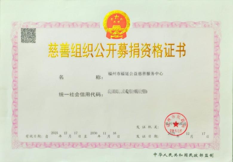 12月17日上午,福州市福延公益慈善服務中心正式獲得公開募捐資格證書。這一資質的取得,標志著中心在規范化、專業化發展道路上再邁關鍵一步,更將為公益項目拓寬資金渠道、擴大服務覆蓋面、深化幫扶實效提供核心支撐。