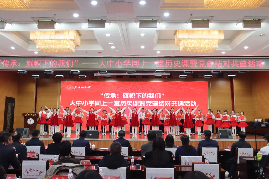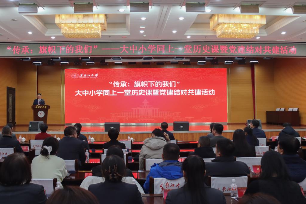 12月12日下午,由黑龍江大學主辦,黑龍江大學歷史文化旅游學院、哈爾濱師范大學附屬中學、哈爾濱市第四十七中學、哈爾濱市師范附屬小學校承辦的“傳承:旗幟下的我們”——大中小學同上一堂歷史課暨黨建結對共建活動在主樓一樓報告廳舉行。校黨委書記遲寶旭,校黨委副書記李君明,副校長魏影,哈爾濱市教育局、哈爾濱市南崗區教育局、協辦單位主要負責人以及四所學校師生代表參加活動。活動由李君明主持。