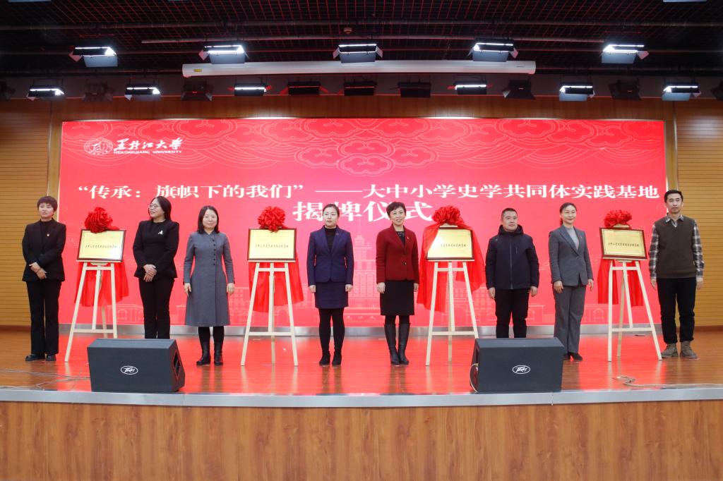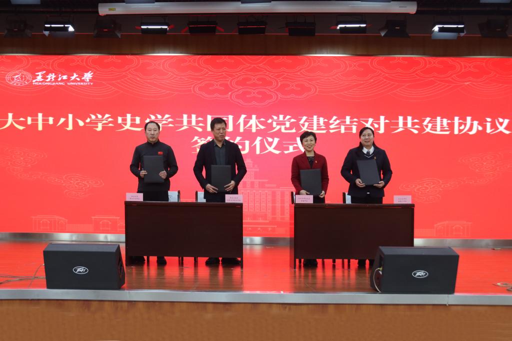 黑龍江大學歷史文化旅游學院、哈爾濱師范大學附屬中學、哈爾濱市第四十七中學、哈爾濱市師范附屬小學校主要負責人共同簽署《大中小學史學共同體黨建結對共建協議書》。