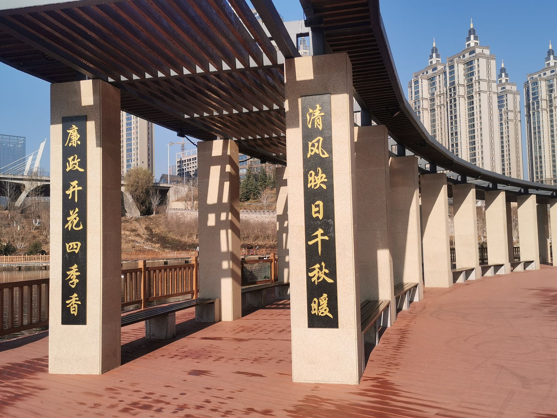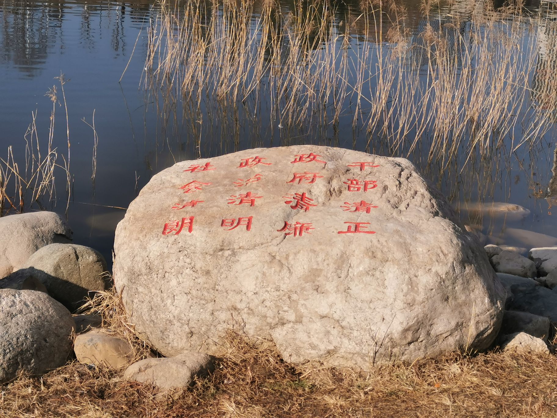 從中心大道立交橋下折返,沿河道東側步道往回走,廉政文化區域映入眼簾,幾塊景觀石錯落擺放,其中一塊巨石上鐫刻著“干部清正、政府清廉、政治清明、社會清朗”十六個紅色大字,遒勁有力,在陽光下熠熠生輝。