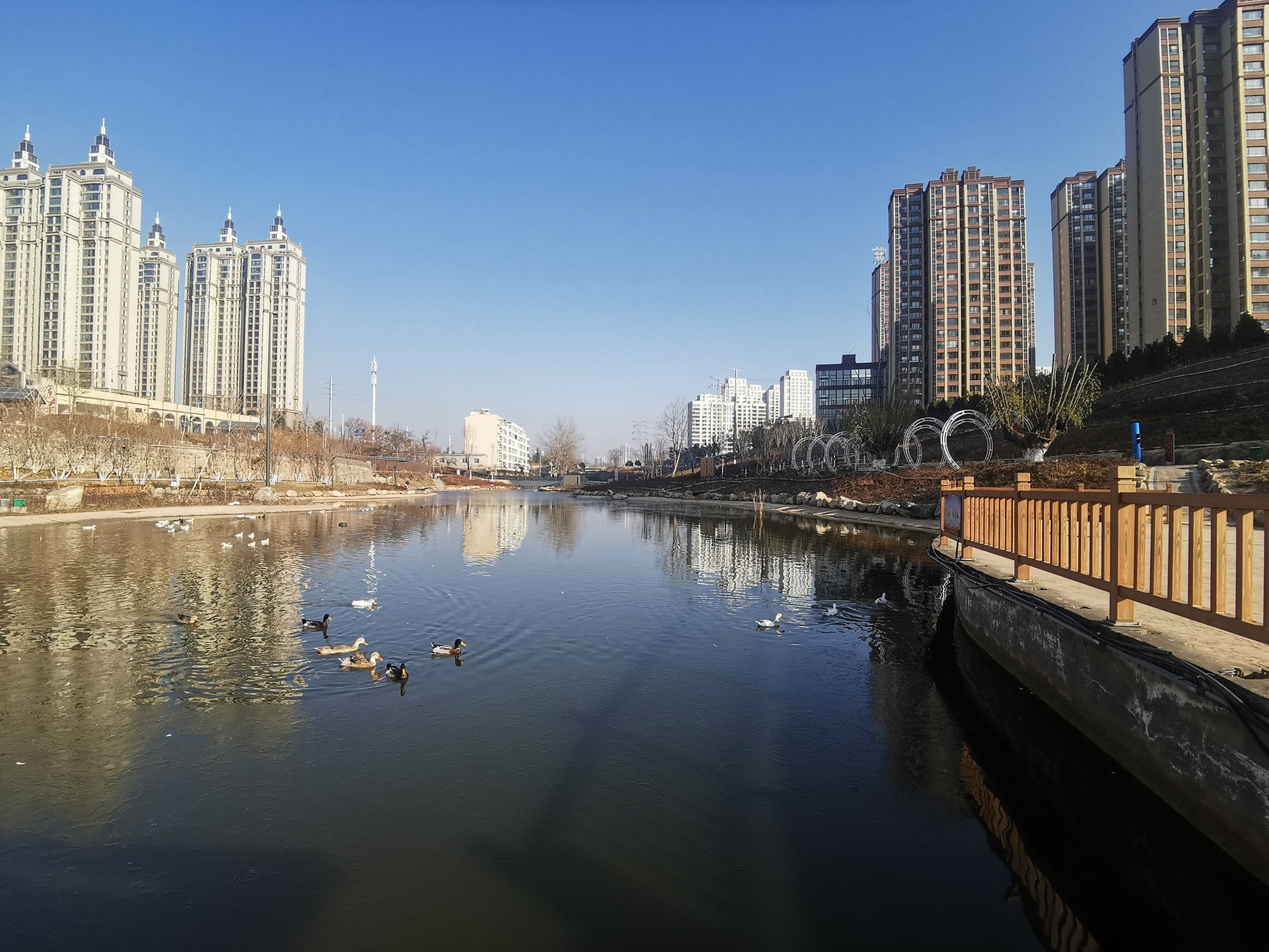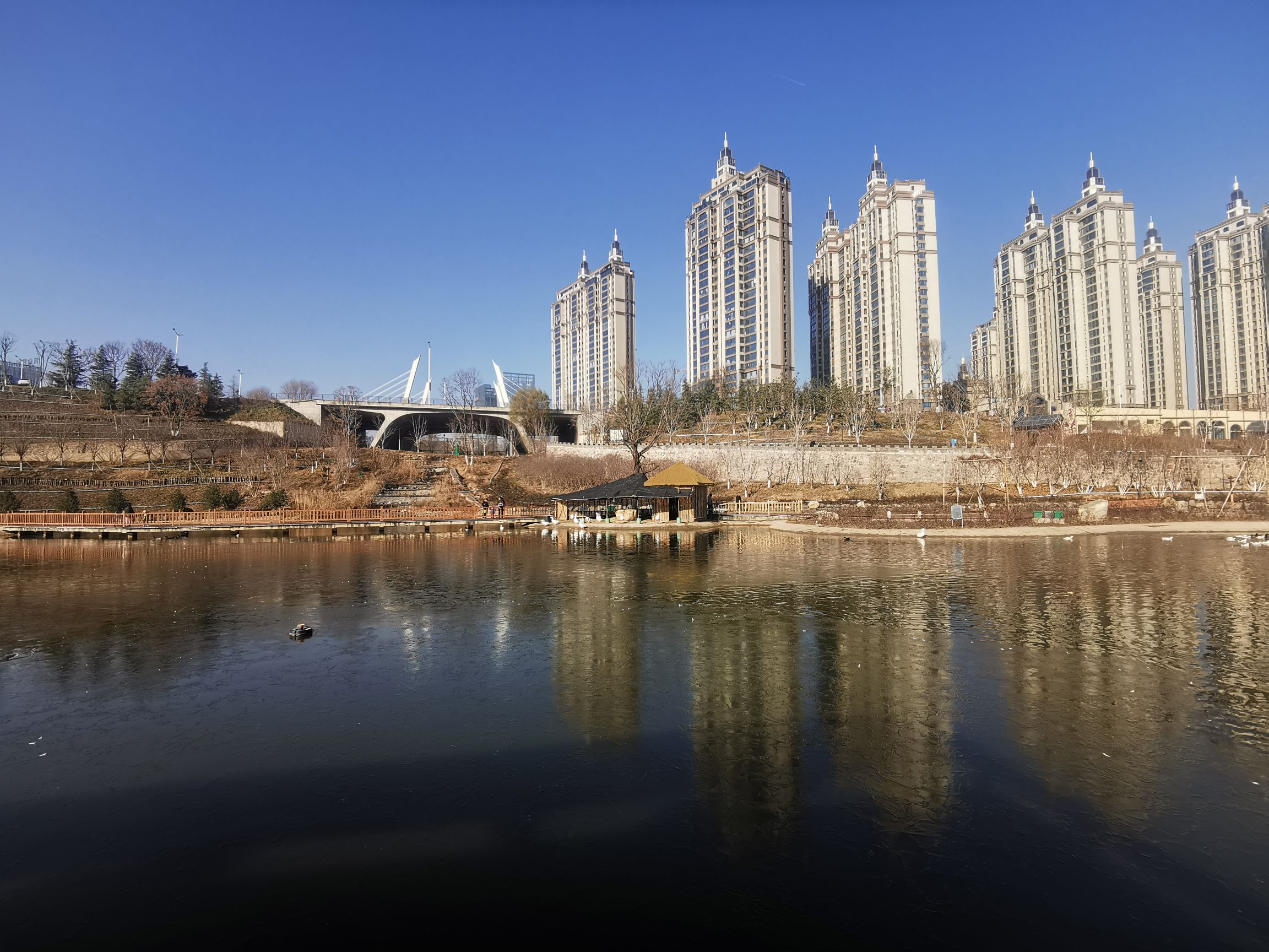 不遠處湖面結了薄冰,如透明琉璃覆在水面,陽光傾瀉而下,折射出澄澈刺眼的光芒,恰似展開的巨大銅鏡,映照著藍天白云、岸樹與高樓。“冰面無風鏡未磨”,宋人意境在此鮮活,冰下湖水并未沉寂,細小漣漪悄悄涌動,似在蓄力等待春來解凍。
