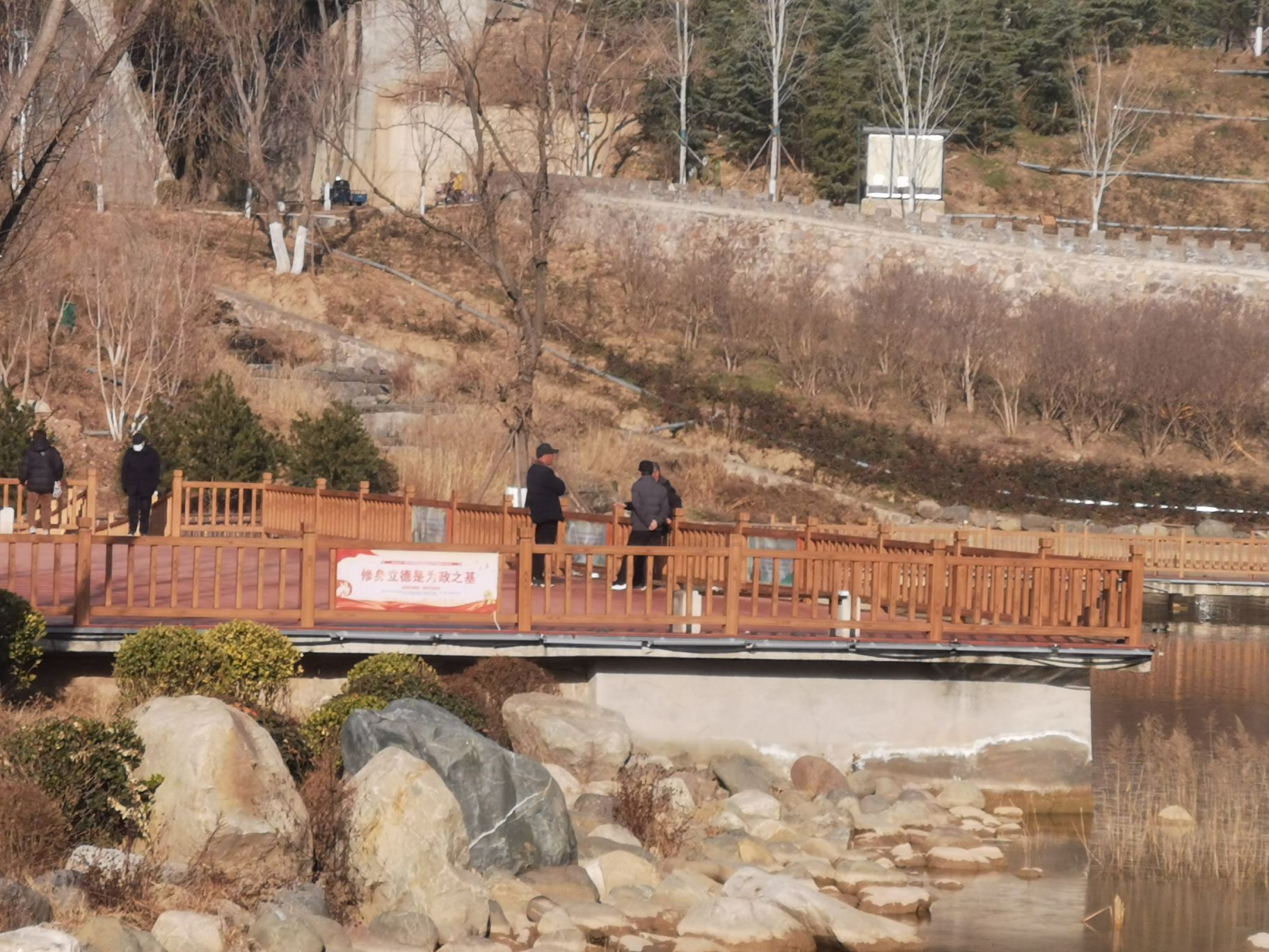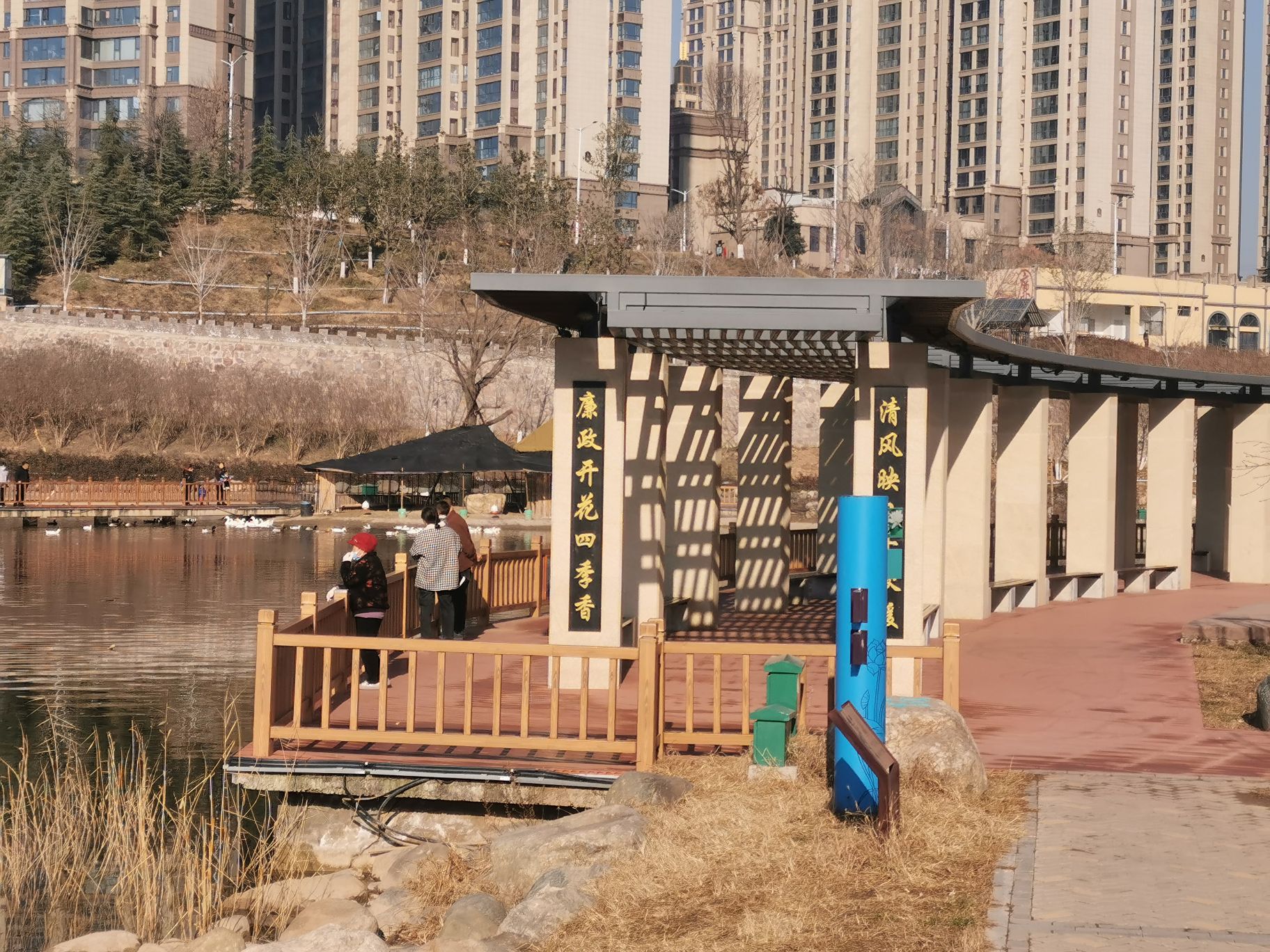 行至愛蓮說觀景臺,這里視野開闊,幾位老人站在護欄旁曬太陽閑聊。他們神情閑適恬淡,銀白的發絲泛著暖陽光暈,眼角皺紋透著歲月沉淀的從容。語速舒緩,偶爾傳來爽朗笑聲,話題不離家常與園景。老人的身影與暖陽、冰湖、枯樹相映,構成“晚來天欲雪,能飲一杯無”的閑適畫卷,讓人忘卻冬日寒涼,心頭暖意融融。