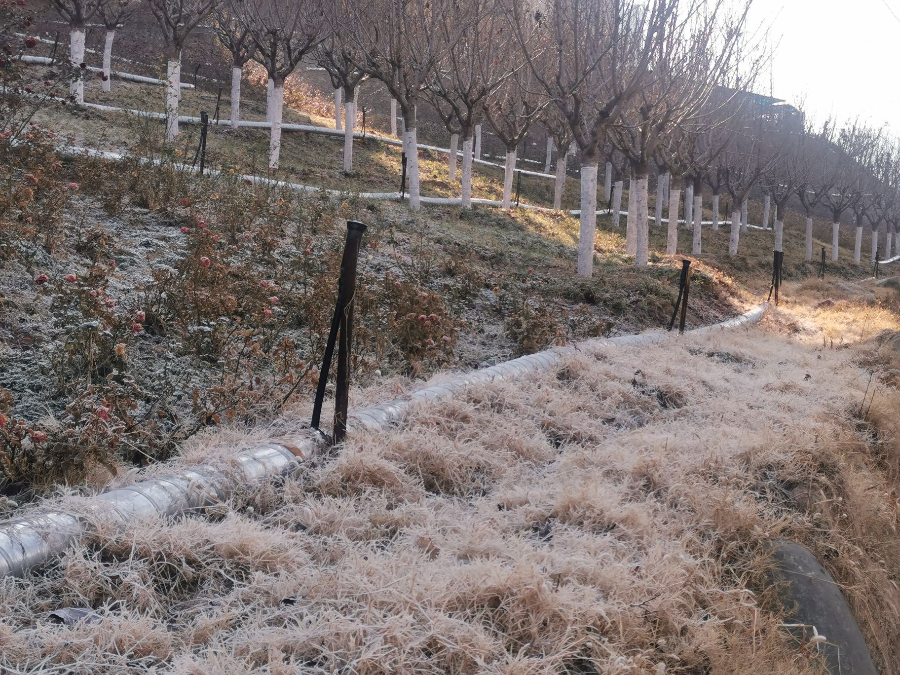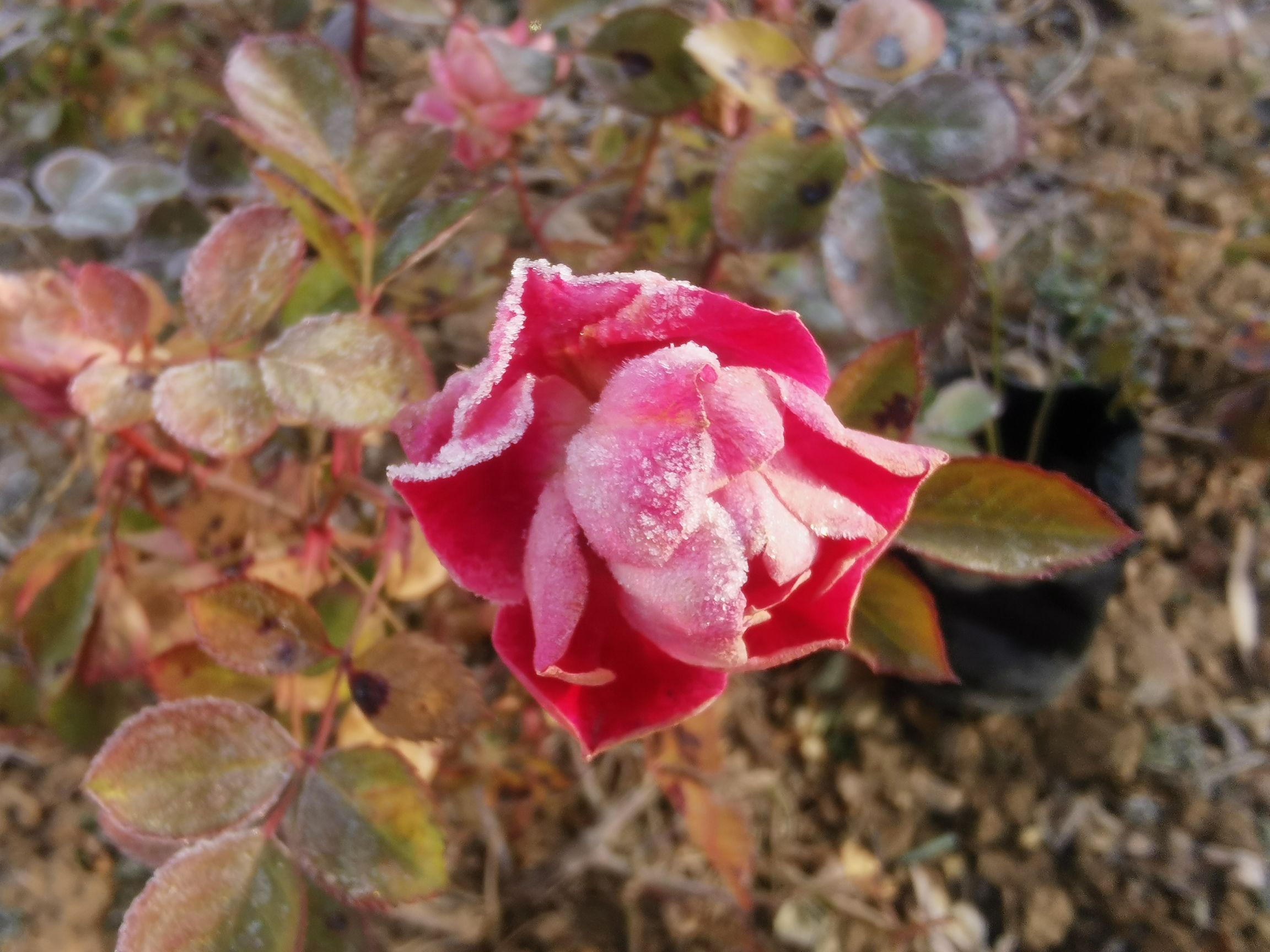 路邊的其他灌木叢褪去了往日蔥蘢,遒勁枝條凝著霜粒,宛若玉雕珊瑚,精致得不忍觸碰。最動人是那成片的月季,未因嚴寒枯萎,霜花映襯下更顯風骨。墨綠葉片邊緣泛著淡紅,層層花瓣頂端凝著細碎霜粒,如裹冰晶鎧甲,褪去盛夏濃艷,多了凌寒不屈的從容。微風拂過,花瓣輕顫,霜粒簌簌落在枯草上,細微聲響在寂靜晨色中格外清晰。