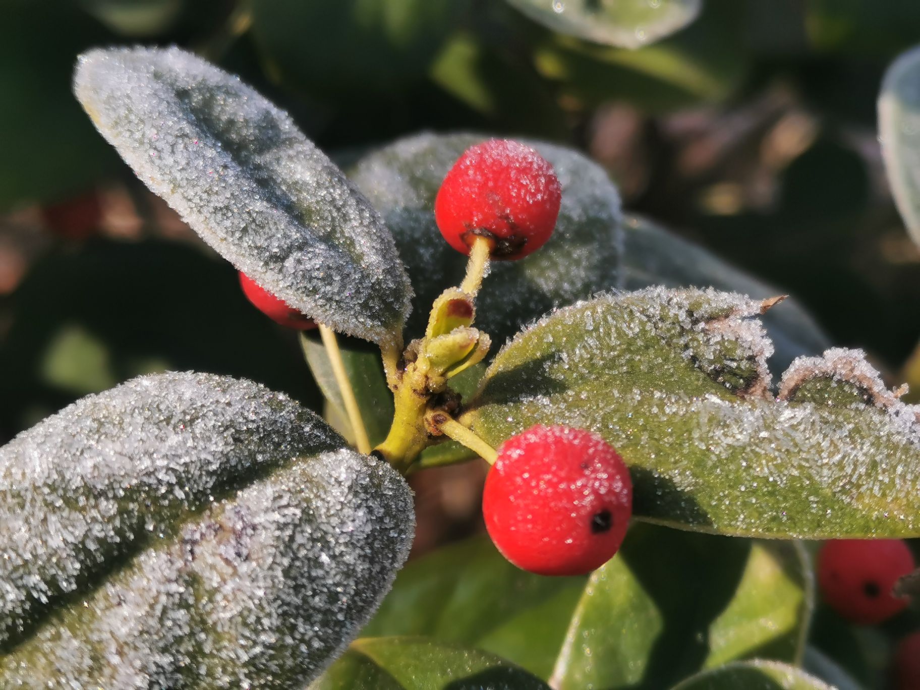 “霜輕未殺萋萋草,日暖初干漠漠沙”,白居易筆下的冬景此刻具象鋪展。薄霜未扼草木生機,反倒為枯寂枝頭裹上輕紗,添了幾分剔透朦朧。低矮的冬青,翠綠的葉子布滿白霜,枝頭點綴著許多紅色豆豆,我好奇地掏出手機拍照。